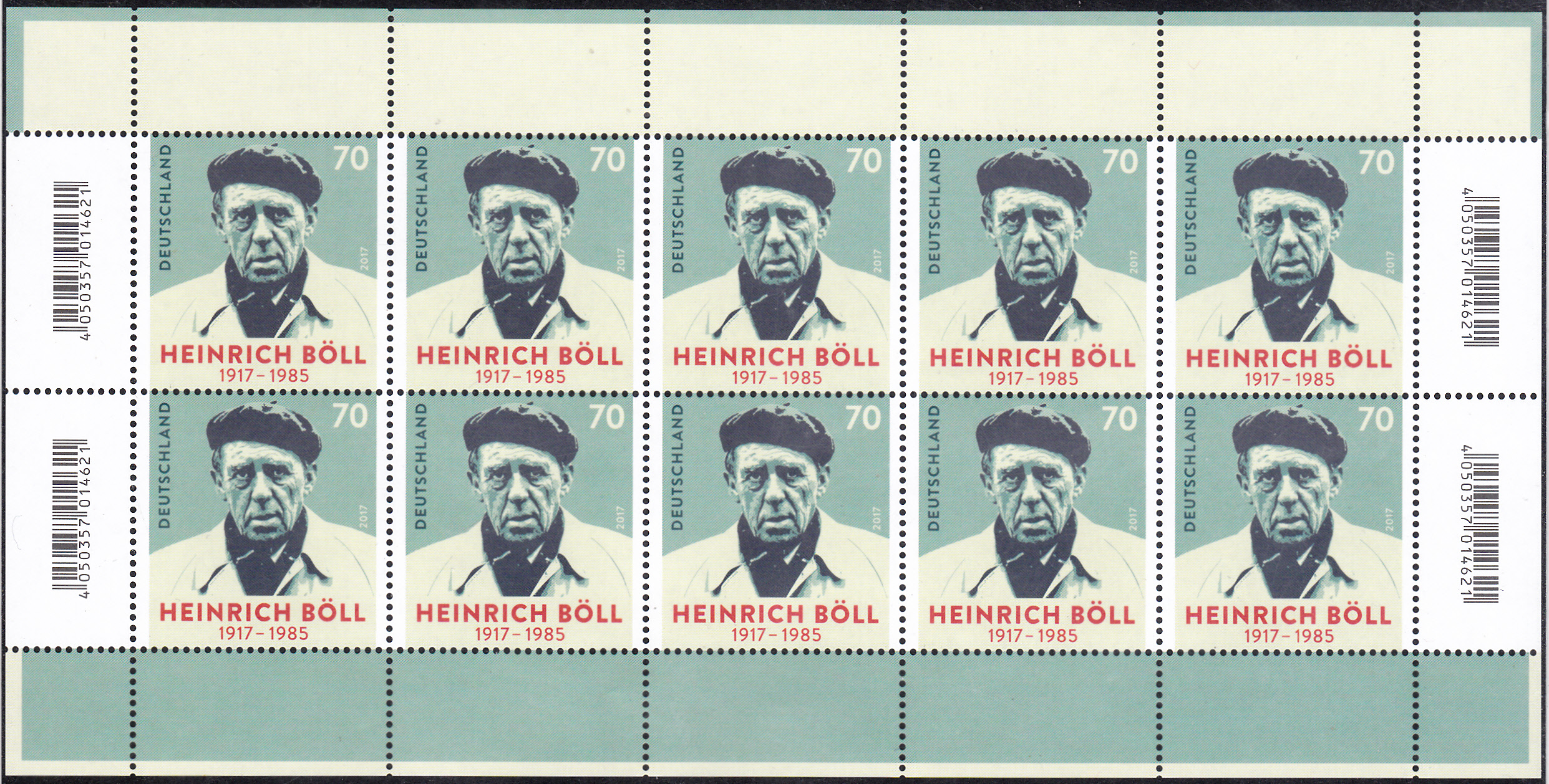 Zu seinem 100. Geburtstag erschein bei der Deutschen Post eine Sondermarke (MiNr 3350) mit seinem Porträt. Hier ein Eckrandstück mit EAN-Code.