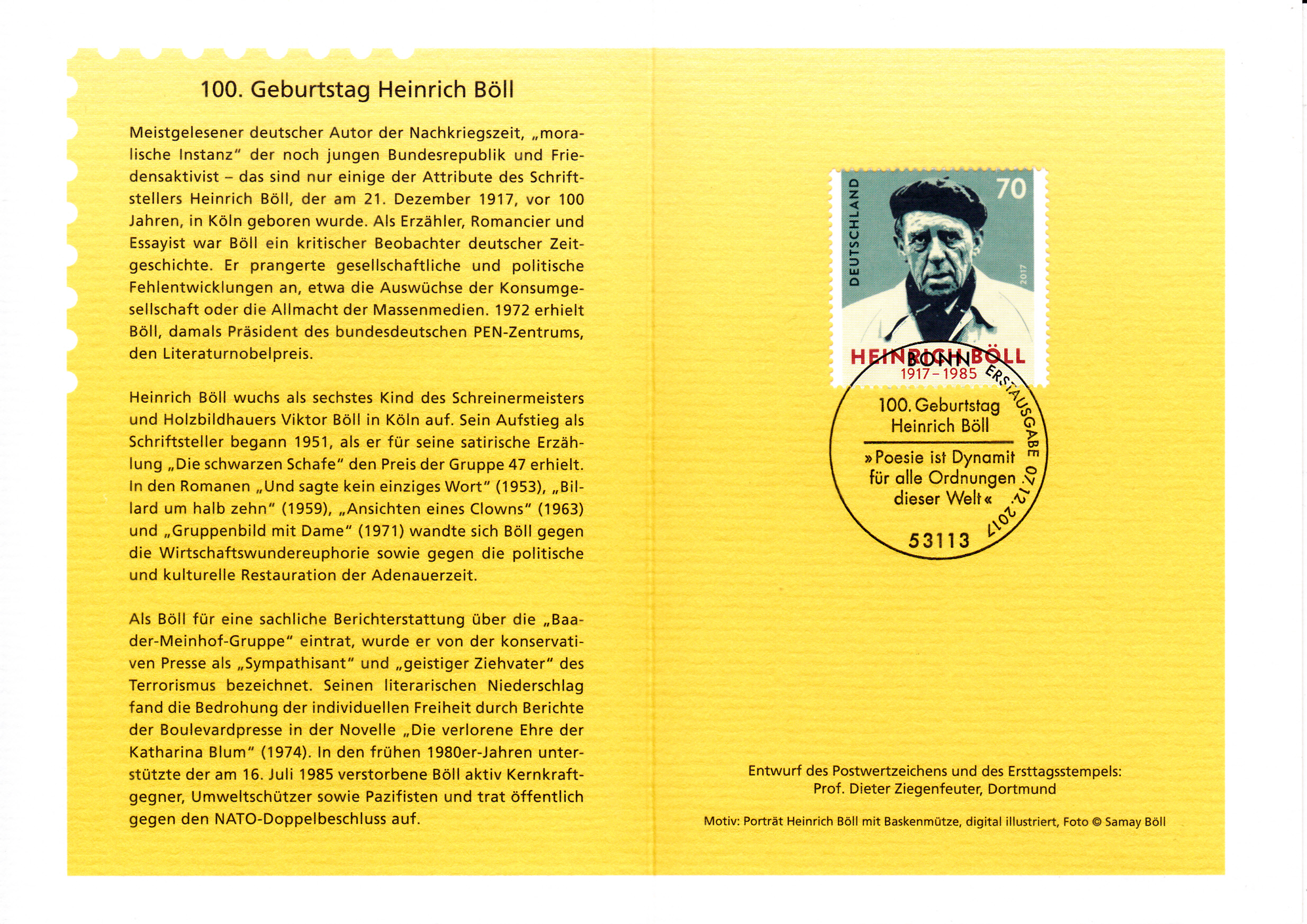 Heinrich Böll (geb. 21. Dezember 1917 in Köln; gest. 16. Juli 1985 in Kreuzau-Langenbroich) ist einer der bedeutendsten deutschen Schriftsteller der Nachkriegszeit. 1972 erhielt er den Nobelpreis für Literatur für seine literarische Arbeit "die durch ihren zeitgeschichtlichen Weitblick in Verbindung mit ihrer von sensiblem Einfühlungsvermögen geprägten Darstellungskunst erneuernd im Bereich der deutschen Literatur gewirkt hat".