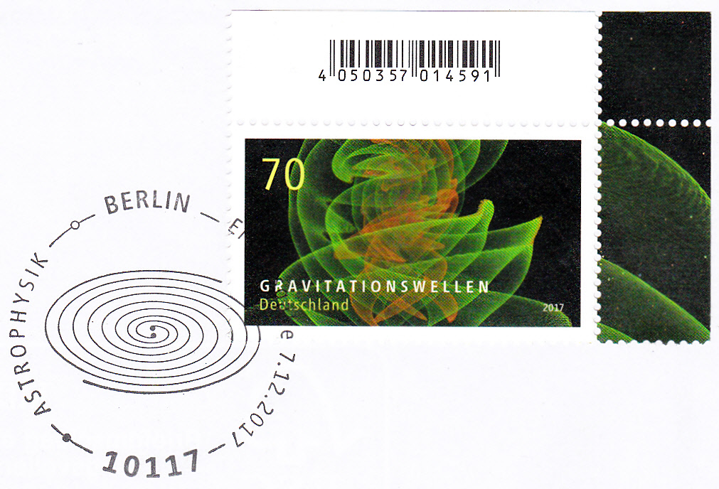 Bei der Deutschen Post erschien am 7.12.2017 eine Marke (MiNr 3348) die Gravitationswellen darstellt. Hier eine Marke vom Eckrand mit EAN-Code.