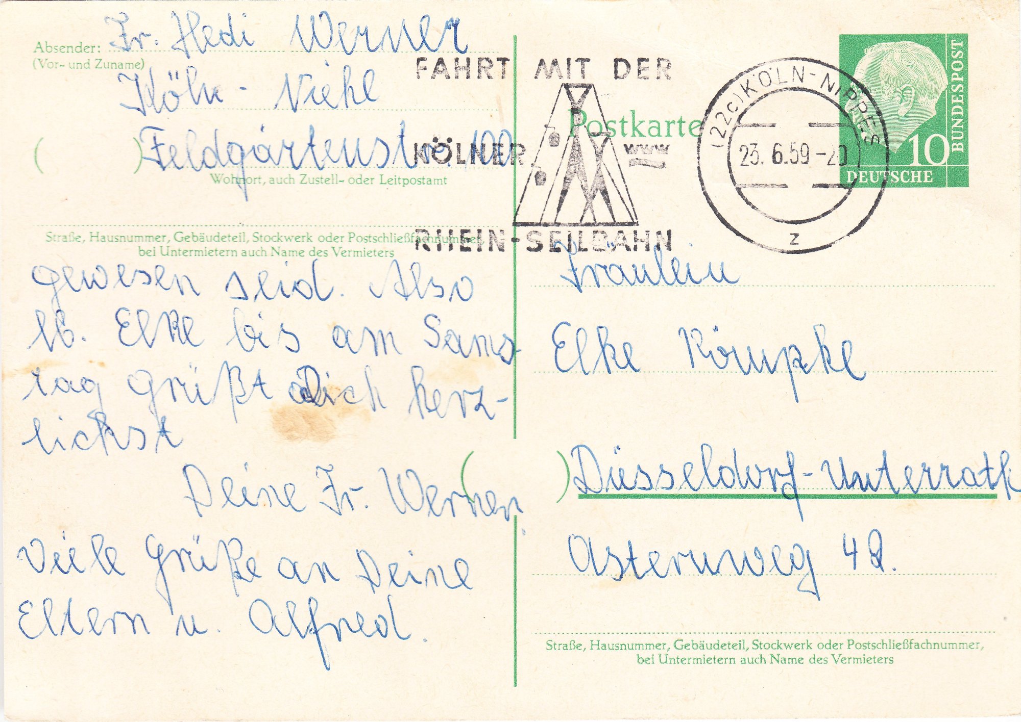 Am 23.06.1959 machte der Werbeeinsatz dieses Maschinenstempels KÖLN-NIPPES Werbung "FAHRT MIT DER KÖLNER RHEIN-SEILBAHN":