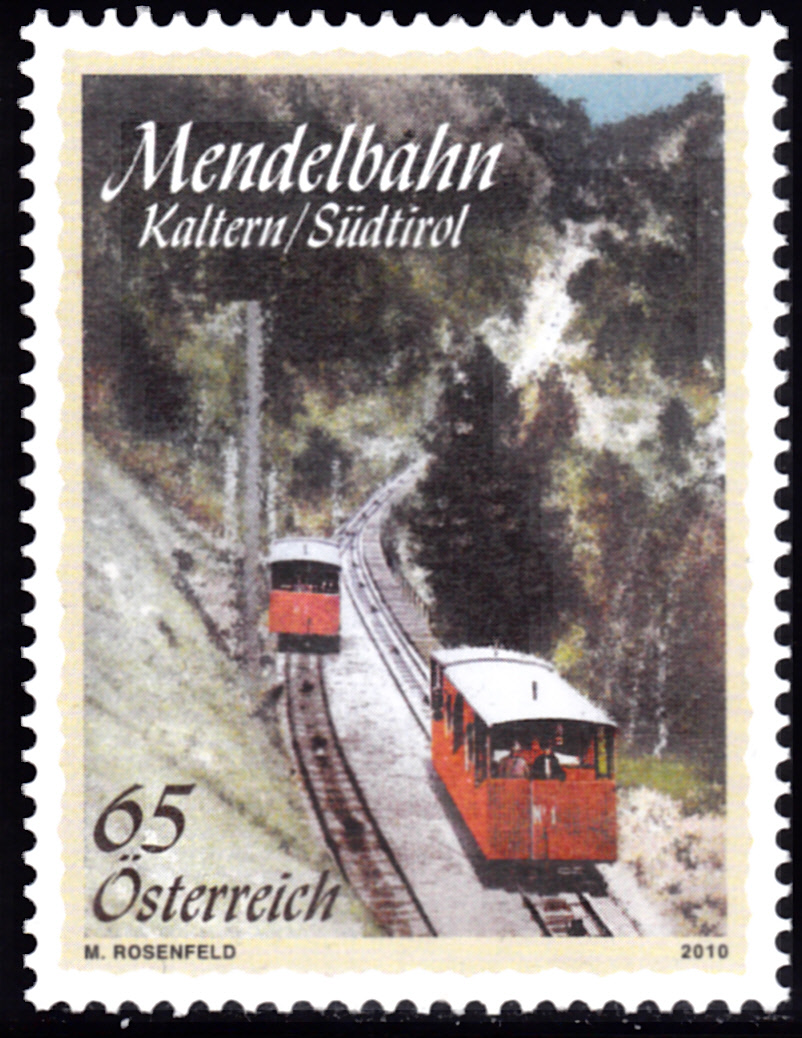 Diese Marke aus Österreich (MiNr 2864) zeigt die Mendelbahn im Markenbild.