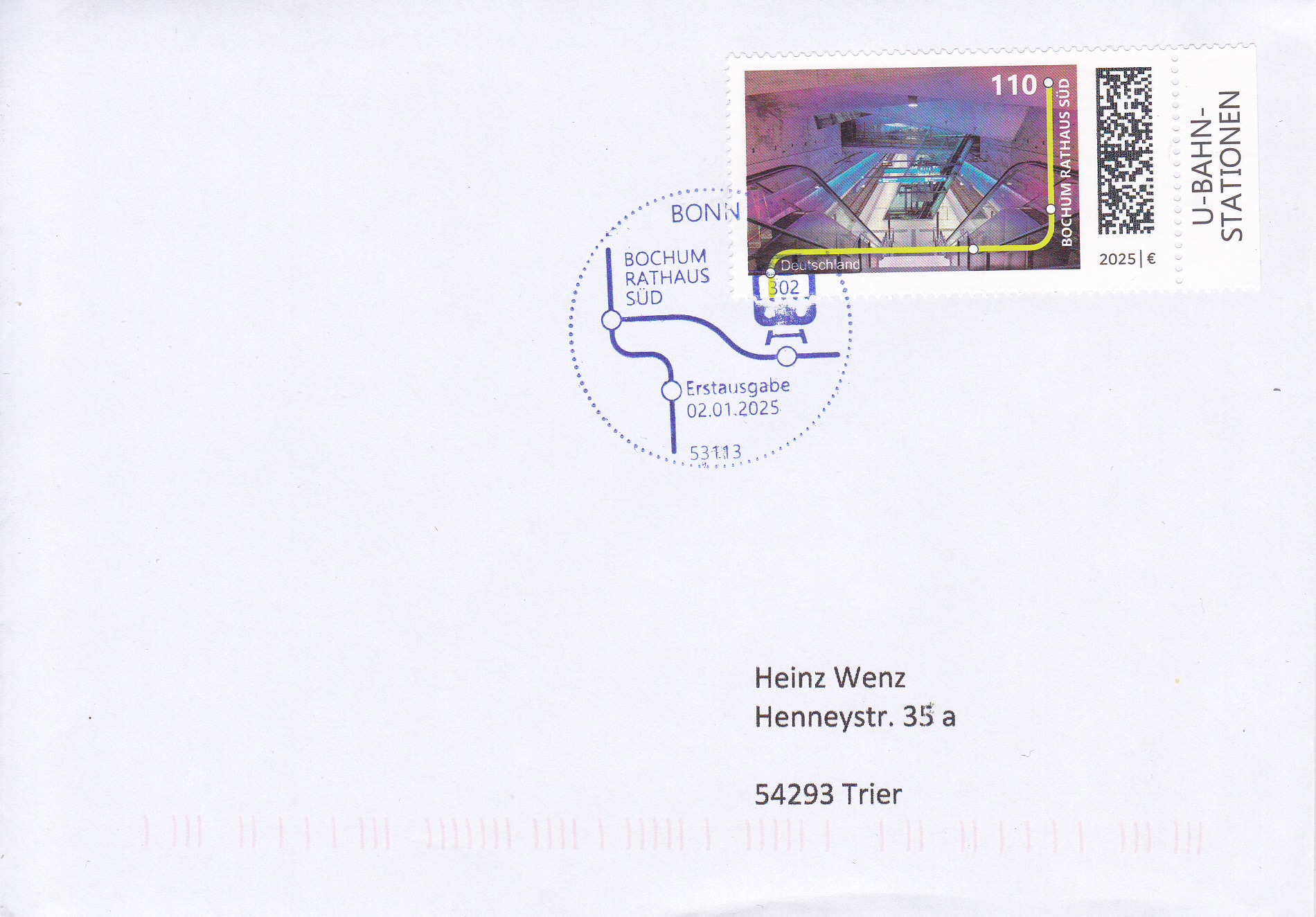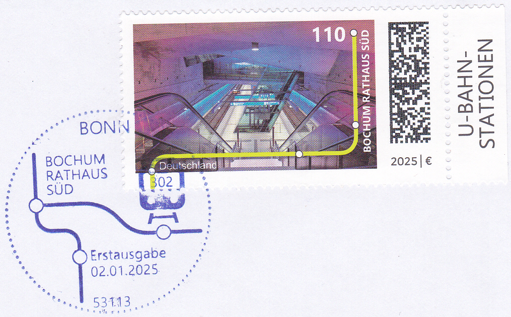 Ersttagsbrief mit der Marke zur U-Bahn-Haltestelle Rathaus Süd in Bochum (MiNr 3878) und dem Ersttagstempel Bonn.
