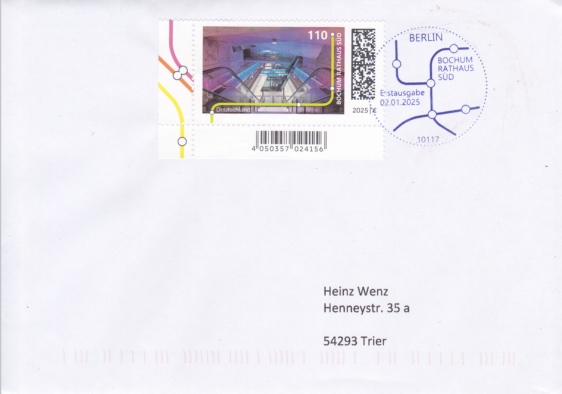 Brief vom Ersttag der Marke "U-Bahn-Haltestelle Rathaus Süd in Bochum" (MiNr 3878) mit dem Ersttagsonderstempel Berlin.