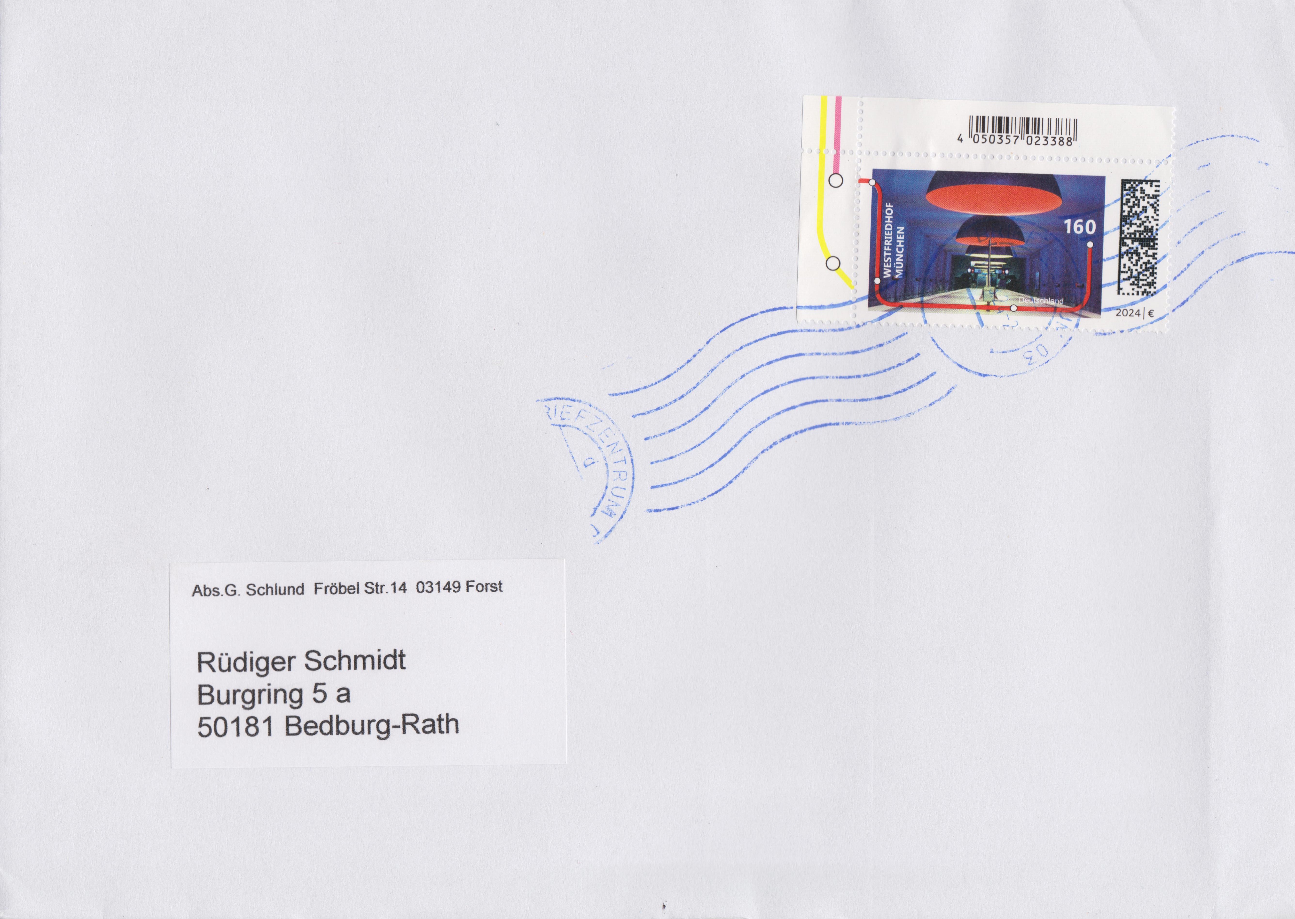 Bei der Deutschen Post ist 2024 eine Marke (MiNr 3807) erschienen mit einer Abbildung der U-Bahn-Haltestelle Westfriedhof in München. Hier zeige ich ein Eckrandstück mit EAN-Codierung.