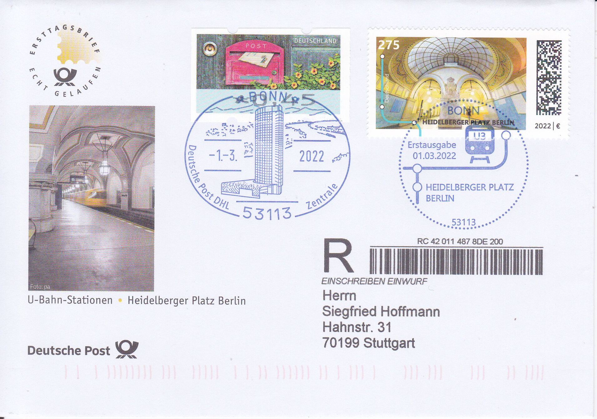 Ersttagsbrief der Deutschen Post per Einschreiben Einwurf mit der Marke zur U-Bahn-Station Heidelberger Platz in Berlin (MiNr 3674) und dem Ersttagstempel Bonn und der Zusatzfrankatur einer Automatenmarke zu 0,45 € mit einem Stempel der Deutschen Post DHL Zentrale in Bonn. Der "Einschreibezettel" wurde bei diesem Brief (ein Ersttagabrief aus dem Abo der Deutschen Post) beim Adressieren direkt aufgedruckt.