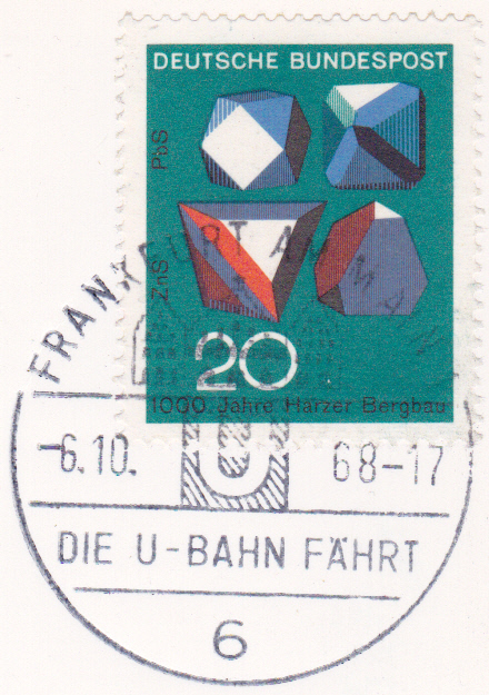 Dazu passt dieser Stempel aus Frankfurt vom 6.10.1968 mit dem Stempeltext "Die U-Bahn fährt".