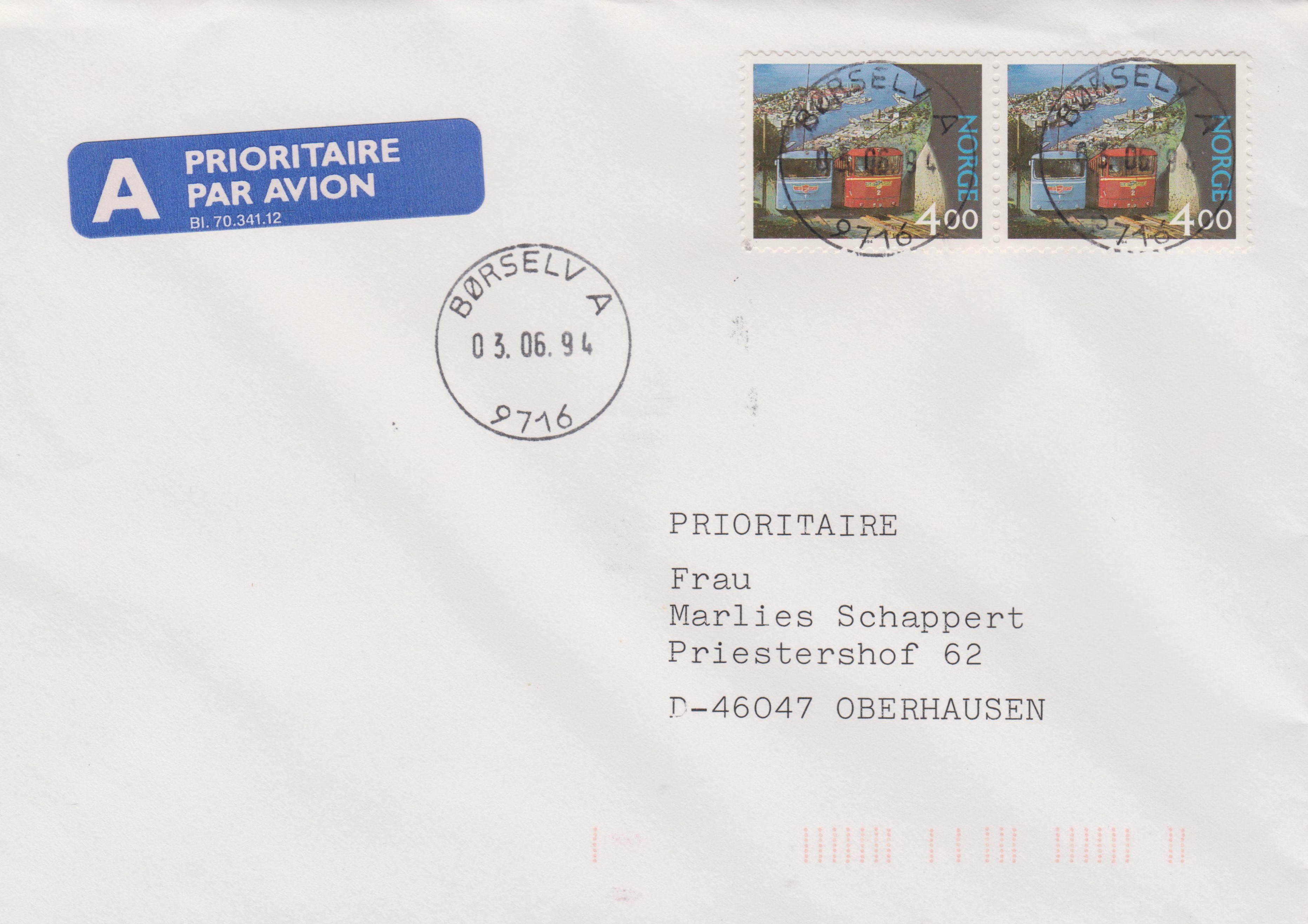 Norwegen MiNr. 1156 zeigt die Kabelbahn Fløyen, hier als Mehrfachfrankatur am 03.06.1994 auf einem Brief nach Deutschland: