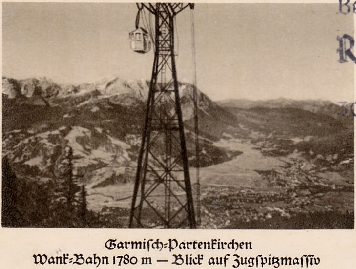 Auf einer Bildpostkarte 1937 (MiNr P 136 Serie 83 Bild 5) zeigt Garmisch-Partenkirchen mit der Wank-Bahn und einem Blick auf das Zugspitzmassiv.