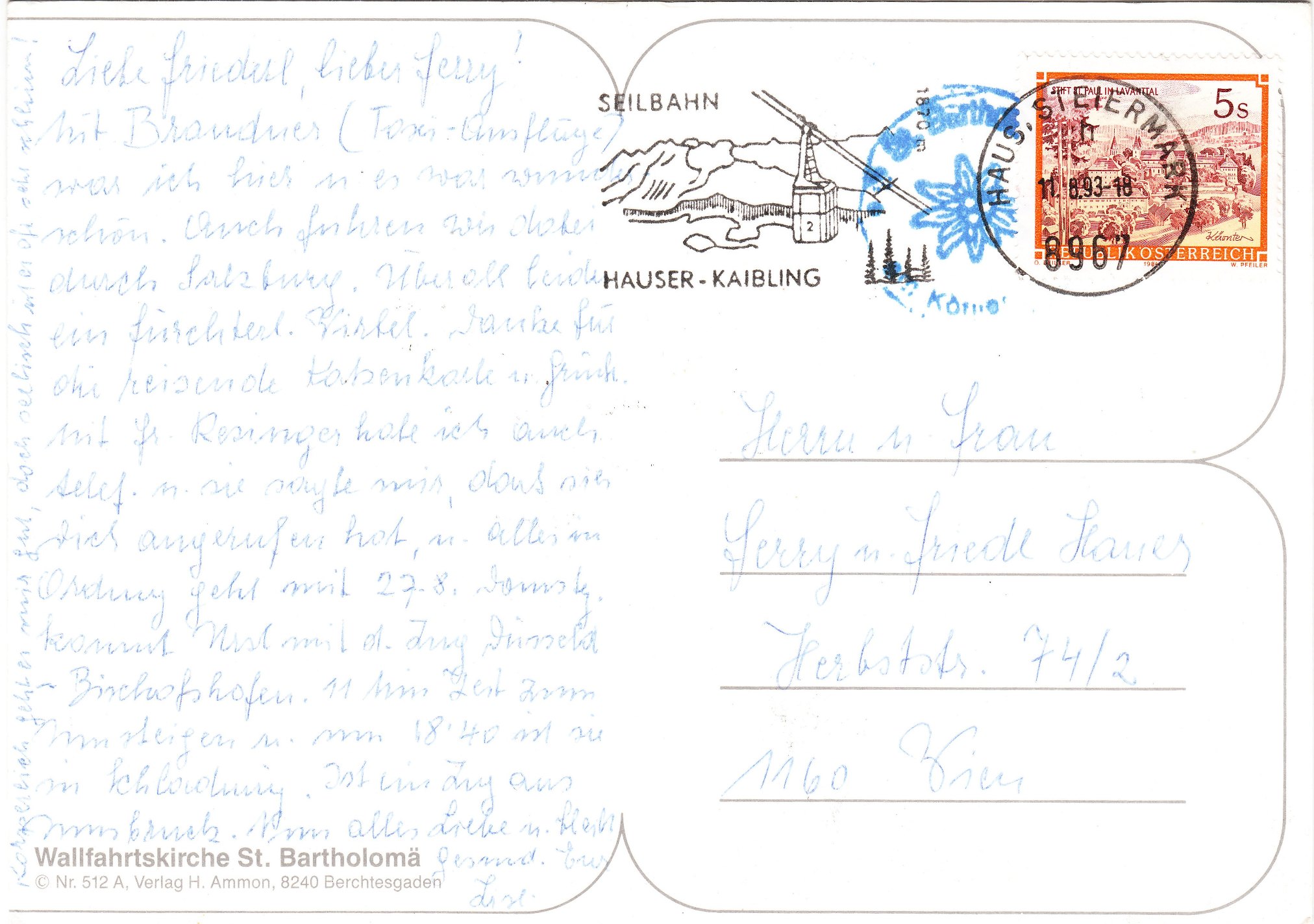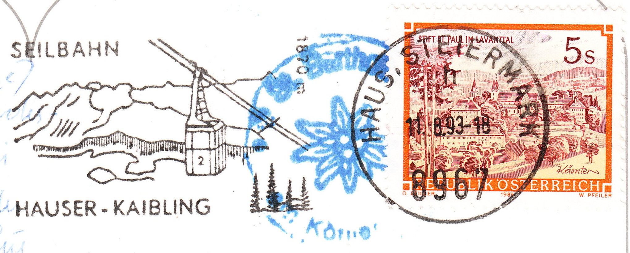 Dieser Maschinenstempel aus Haus in der Steiermark vom 11.08.1993 zeigt im Werbeeinsatz eine Darstellung der Kabine mit der Nummer "2" der Tauernseilbahn, die auf den Hauser Kaibling hinauf führt: