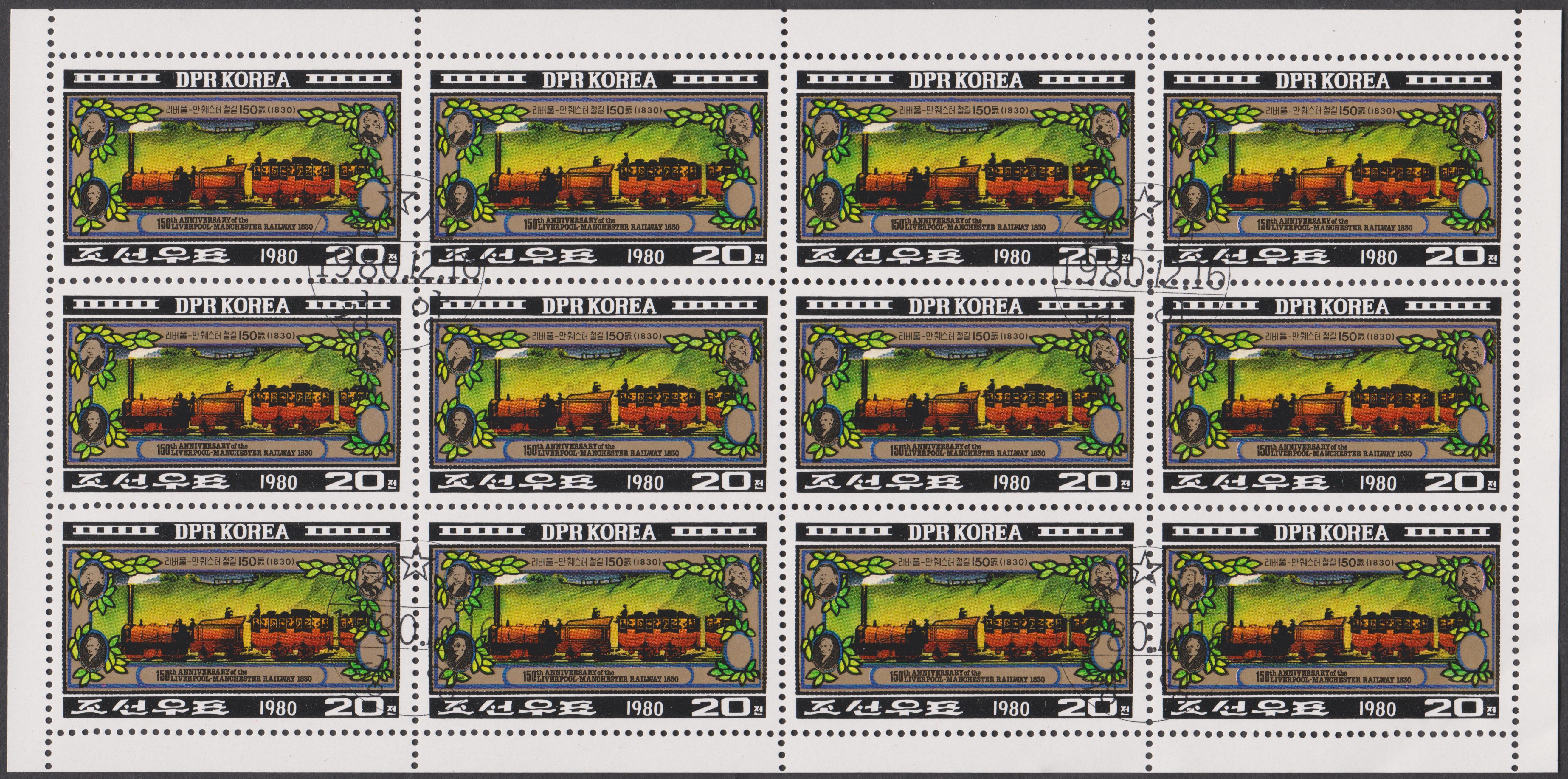 Nordkorea MiNr. 2065 erschien am 16.12.1980 aus Anlaß 150 Jahre Eisenbahnverbindung Liverpool-Manchester.