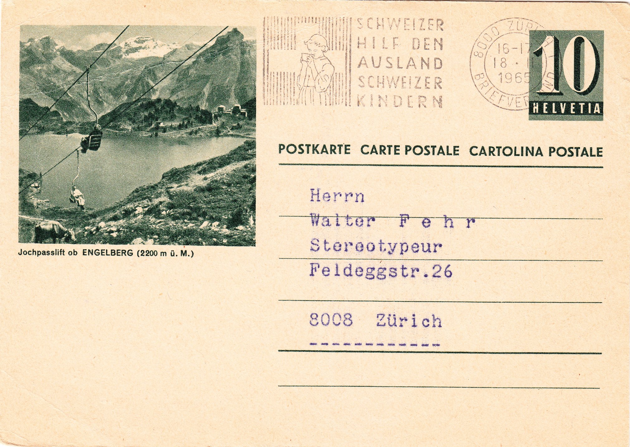 Auf dieser Ganzsache aus der Schweiz findet sich die Abbildung vom "Jochpasslift", einer Sesselbahn mit Sitz für eine Person:
