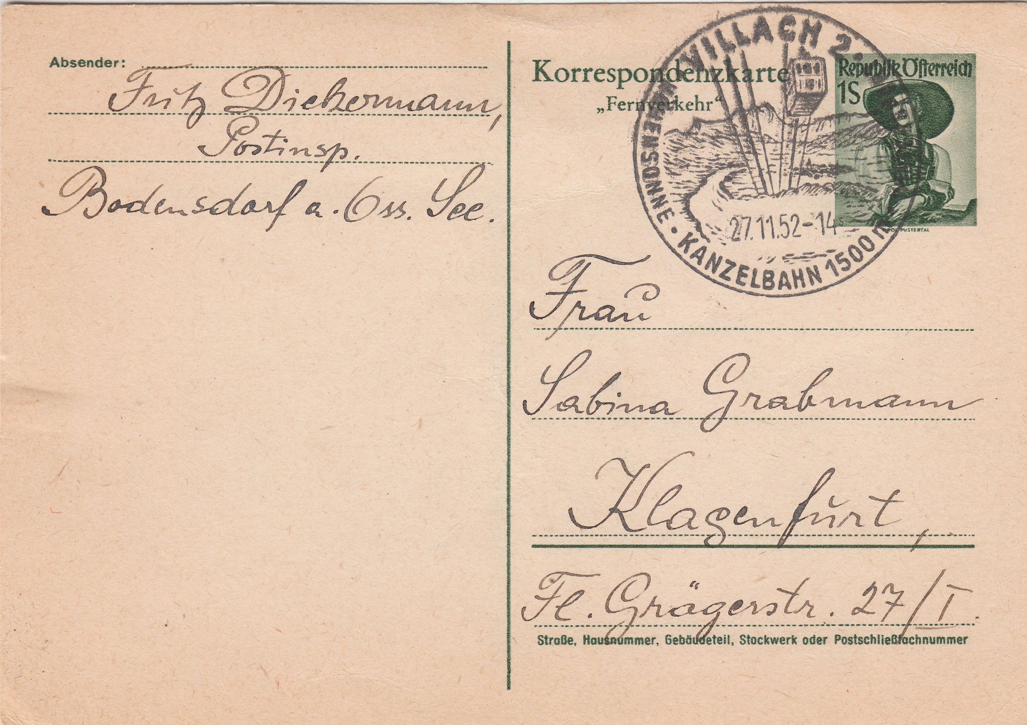 Handwerbestempel aus VILLACH 2 vom 27.11.52 mit einer Darstellung der Kanzelbahn: