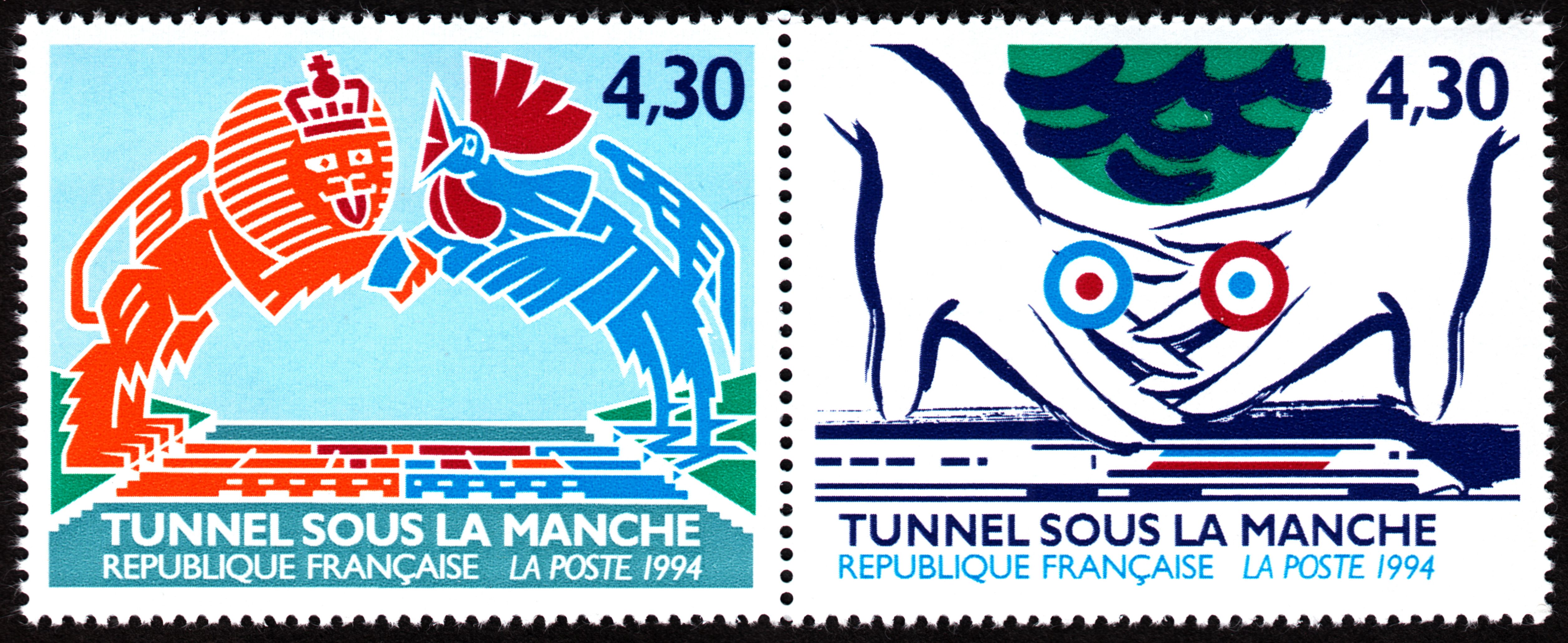 Dieser Zusammendruck Frankreich MiNr. 3025+3026 erschien zur Eröffnung des Eisenbahntunnels unter dem Ärmelkanal: