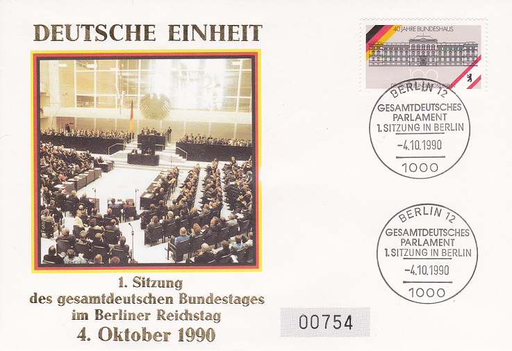 Am ersten Tag nach der Deutschen Einheit und den dazugehörigen Feierlichkeiten trafen sich die Politiker zur 1. Sitzung des neuen gesamtdeutschen Parlaments im Berliner Reichstag. An diese historische Ereignis erinnert dieser philatelistische Beleg: