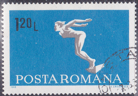 Aus Rumänien kommt diese Marke (MiNr 2153) mit einer Schwimmerin beim Startsprung.