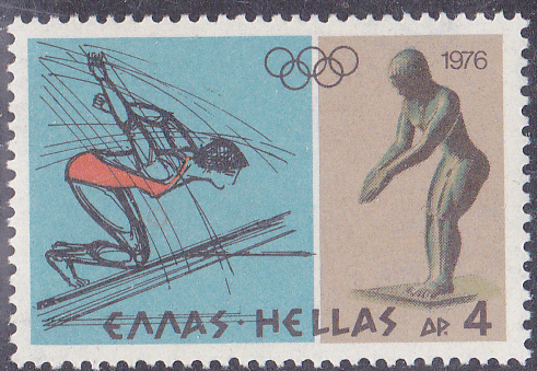 In Griechenland erschien in einer Serie zu den Sommerspielen 1976 diese Marke (MiNr 1243) zum Thema Ringen mit einer Schwimmerin beim Startsprung und eine Statue dazu.