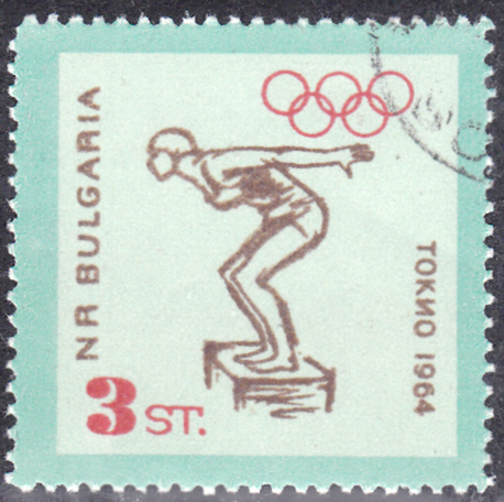 In einer Serie aus Bulgarien zu den Sommerspielen 1964 in Tokio ist diese Marke (MiNr 1490) mit eine Schwimmerin auf dem Startblock erschienen.