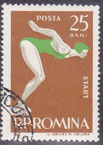Aus Rumänien kommt diese Marke (MiNr 2153) mit einer Schwimmerin beim Startsprung.
