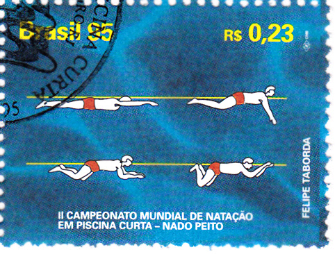 In Brasilien erschien zu den 2. Schwimmweltmeisterschaften auf Kurzbahnen in Rio de Janeiro 1995 diese Marke (MiNr 2682) mit der Darstellung der Bewegungsabläufe beim Brustschwimmen.