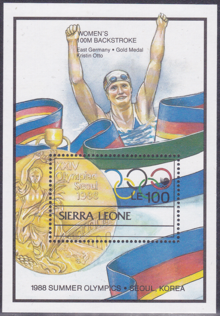 Dieser Block aus Sierra Leone (MiNr Block 96 mit Marke MiNr 1172) ist zum Olympiasieg 1988 durch Kristin Otto (DDR) über 100m Rücken erschienen.