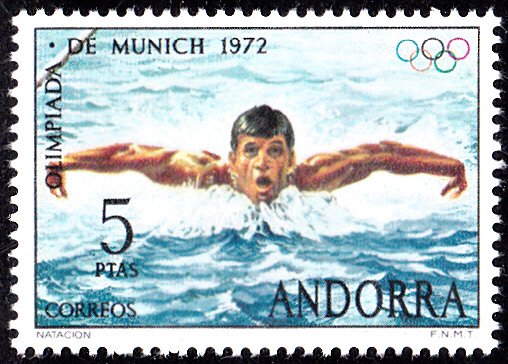 Diese Marke der spanischen Post in Andorra (MiNr 77) zeigt einen Schwimmer beim Schmetterlingsschwimmen.