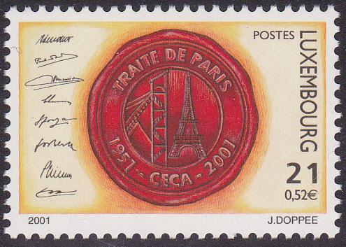 Zum Jubiläum "50 Jahre Pariser Vertrag zur Gründung der Europäischen Gemeinschaft für Kohle und Stahl" erschien in Luxemburg eine Marke (MiNr 1529). Auf der Marke werden die Unterschriften und das Siegel zum Pariser Vertrag gezeigt.