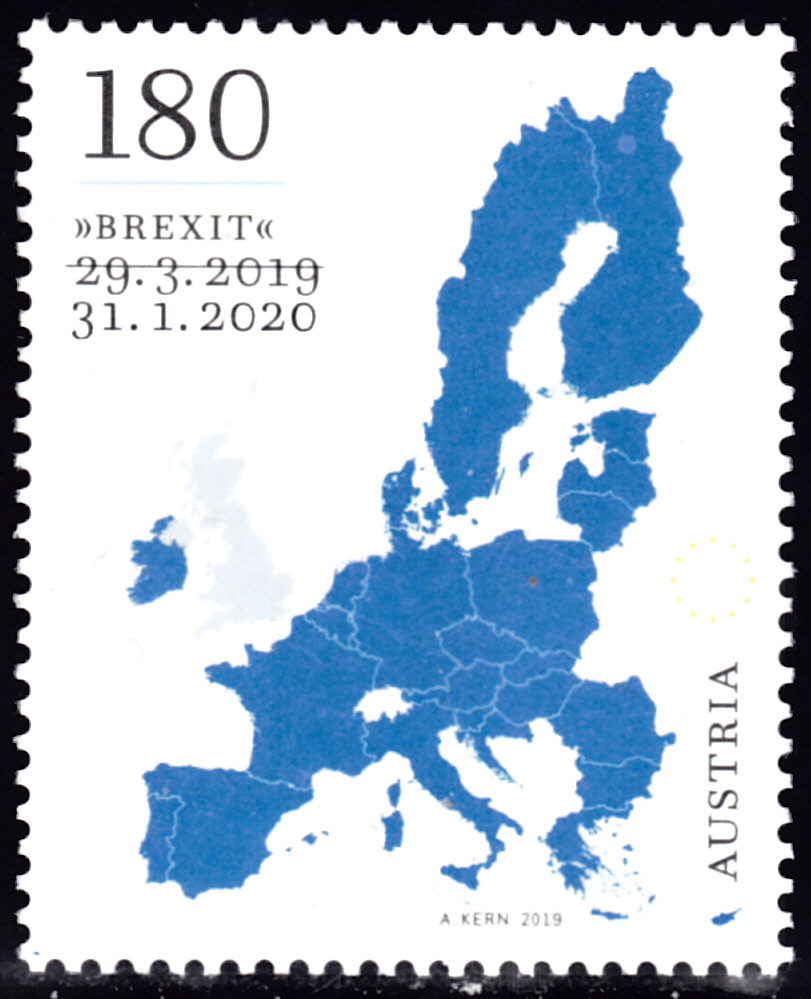 Diese Marke aus Österreich vom 31.1.2020 (MiNr 3503) dokumentiert den Austritt Großbritanniens. Sie war bereits für den 29.3.2019 zur Ausgabe vorgesehen. Wegen der Verschiebung des Brexit wurde sie jedoch jetzt korrigiert verausgabt.