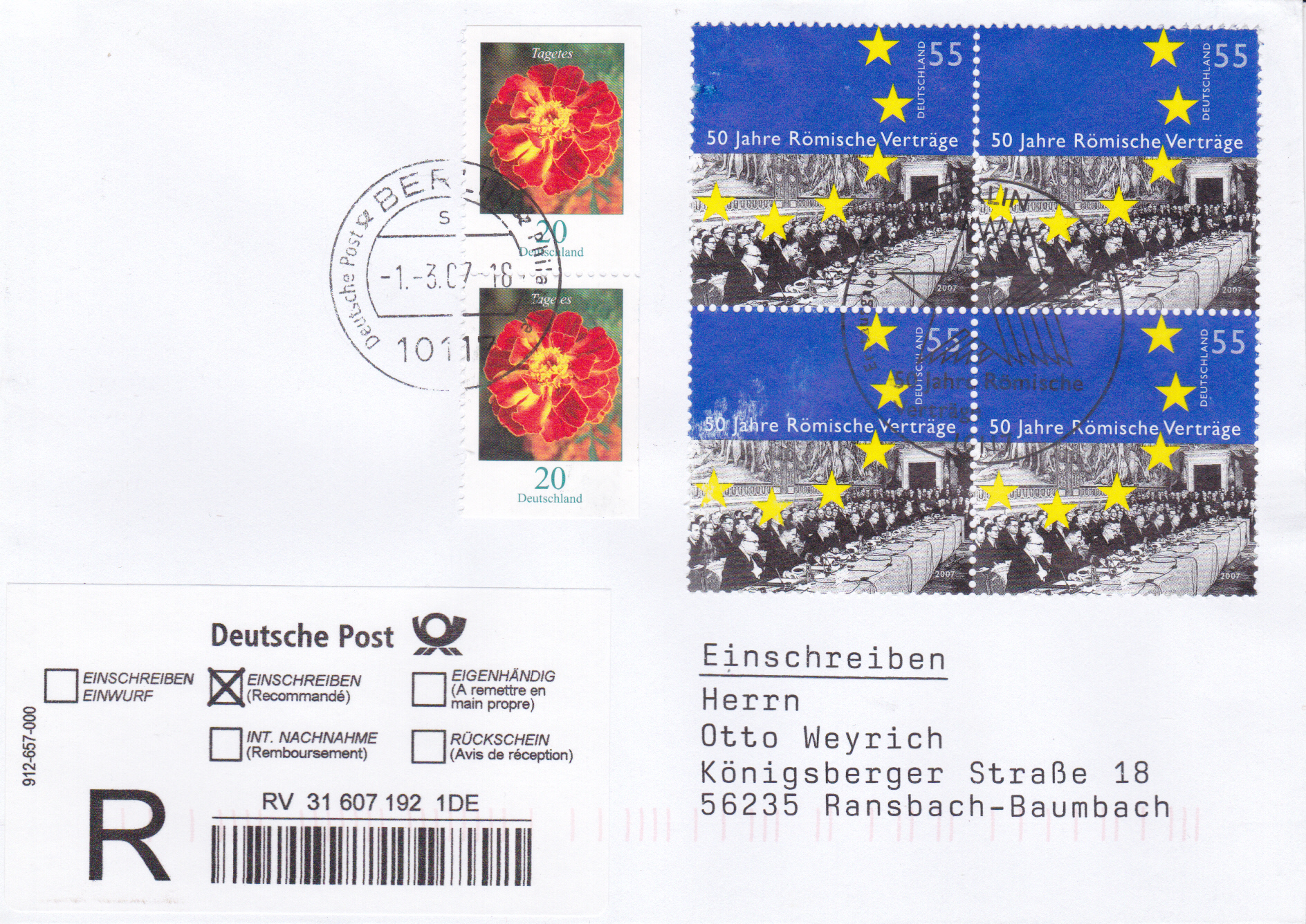 Brief per Übergabe-Einschreiben mit einem Viererblock der Marke "50 Jahre Römische Verträge" (MiNr 2593) und zwei Marken aus der DS "Blumen zu je 20 Cent. Der Viererblock wurde mit dem Ersttagsonderstempel Berlin und die Zusatzfrankatur mit einem Tagesstempel Berlin gestempelt. Das Porto beträgt für den Brief bis 20g 55 Cent und die Zusatzleistung Übergabe-Einschreiben 205 Cent, zusammen also 260 Cent.