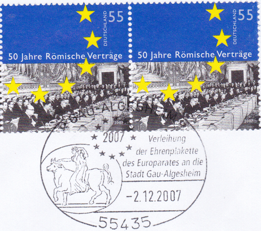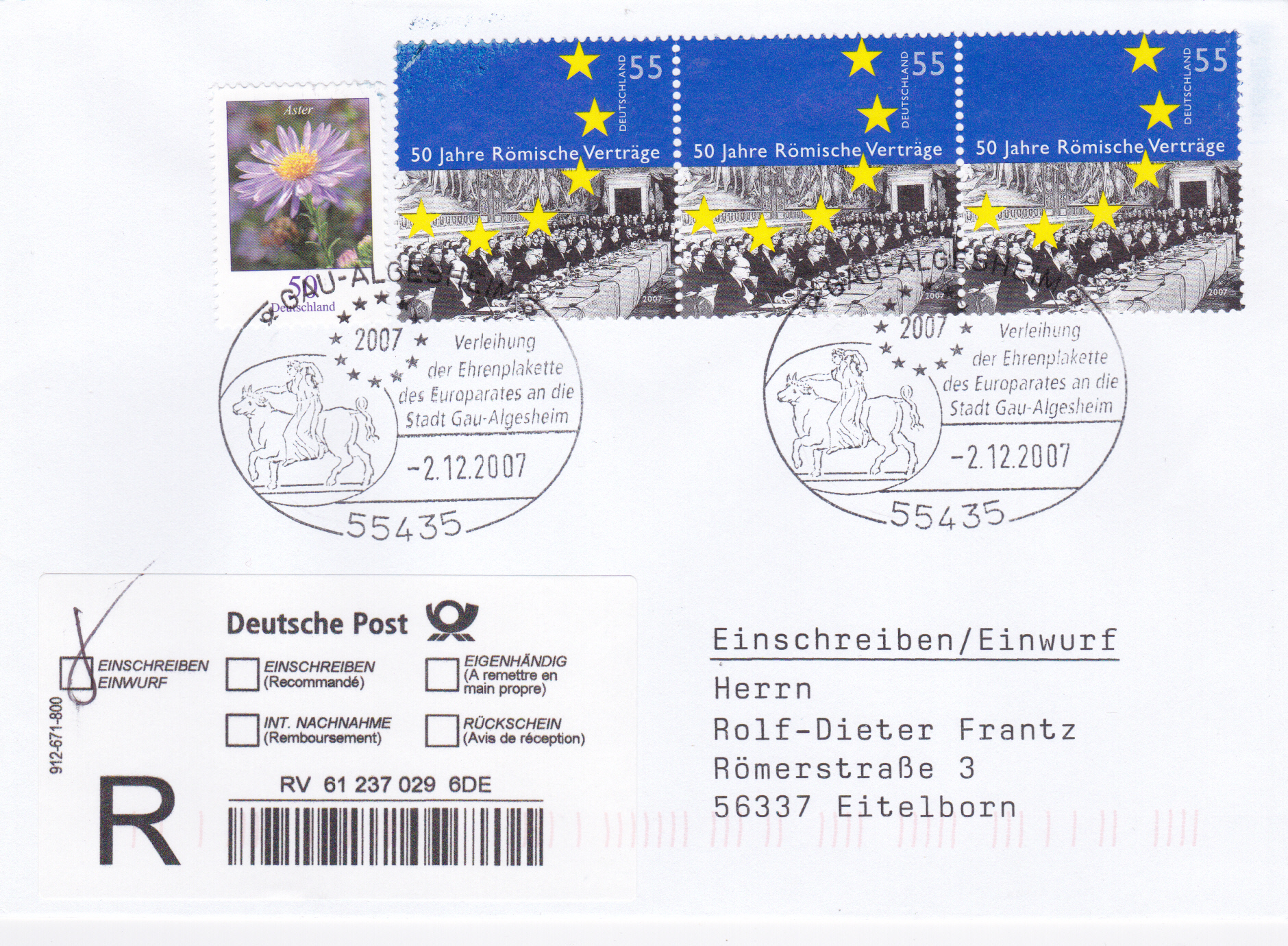 Brief per Einwurf-Einschreiben mit drei Marken "50 Jahre Römische Verträge" (MiNr 2593) und einer Marken aus der DS "Blumen zu 50 Cent mit einem zum Europathema passenden Sonderstempel 2.12.2007 aus Gau-Algesheim zur Verleihung der Ehrenplakette des Europarates. Das Porto beträgt für den Brief bis 20g 55 Cent und die Zusatzleistung Einwurf-Einschreiben 160 Cent, zusammen also 215 Cent.