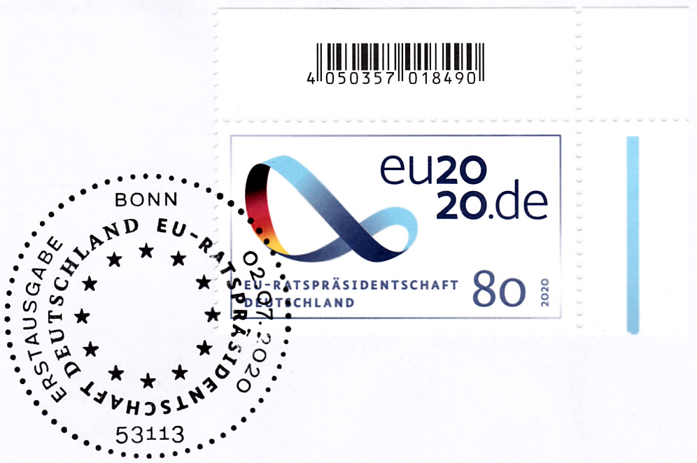 Die Marke der Deutschen Post (MiNr 3554) zur EU-Ratspräsidentschaft Deutschlands wurde auf diesem Brief mit dem Ersttagsonderstempel Bonn gestempelt.