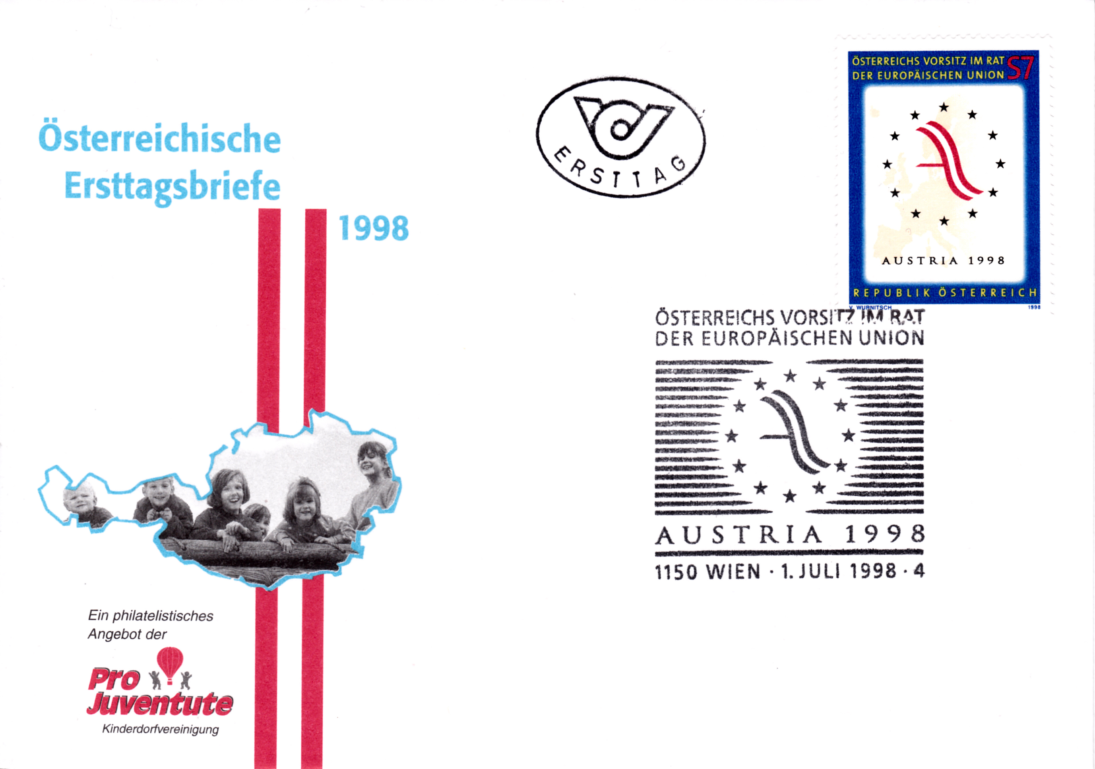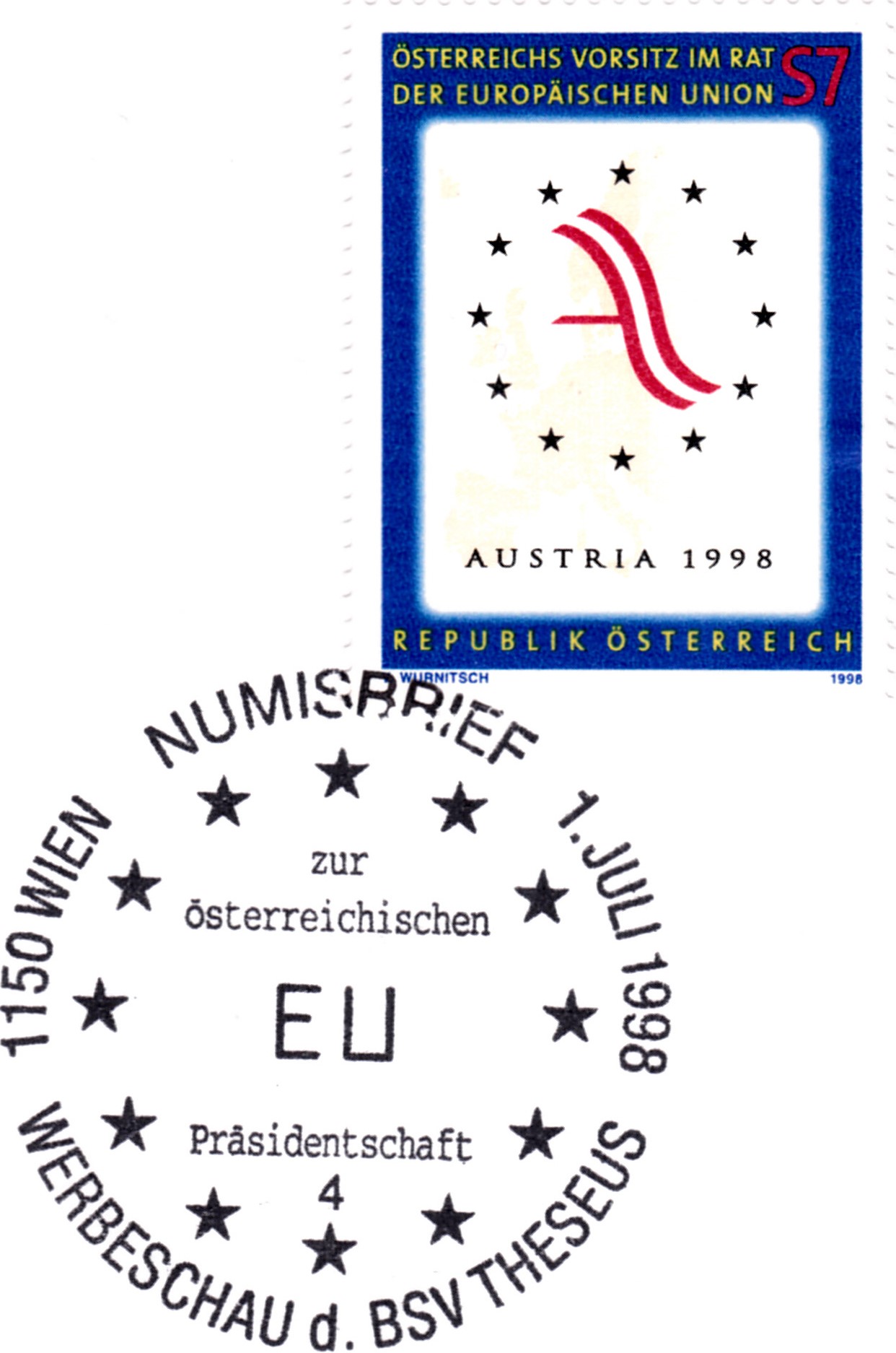 Im zweiten Halbjahr 1998 hatte Österreich den Vorsitz im Rat der Europäischen Union inne. Diese Marke aus Österreich (MiNr 2261) ist am 1.Juli 1998 zu diesem Anlass erschienen. Sie zeigt das Emblem der österreichischen Präsidentschaft und eine Landkarte Europas.