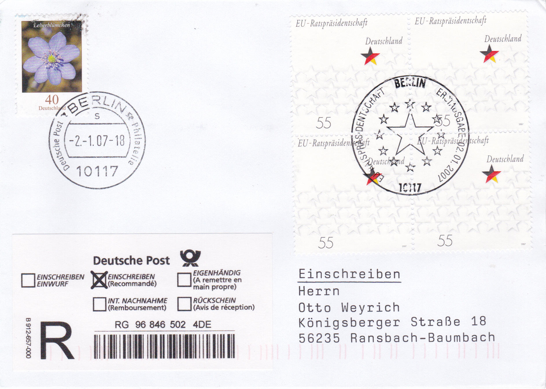 Brief per Übergabe-Einschreiben mit einem Viererblock der Marke zum Vorsitz Deutschlands in der Europäischen Union (MiNr 2583) und einer Marke aus der DS "Blumen zu 40 Cent. Der Viererblock wurde mit dem dem Ersttagsonderstempel Berlin und die Zusatzfrankatur mit einem Tagesstempel Berlin gestempelt. Das Porto beträgt für den Brief bis 20g 55 Cent und die Zusatzleistung Übergabe-Einschreiben 205 Cent, zusammen also 260 Cent.