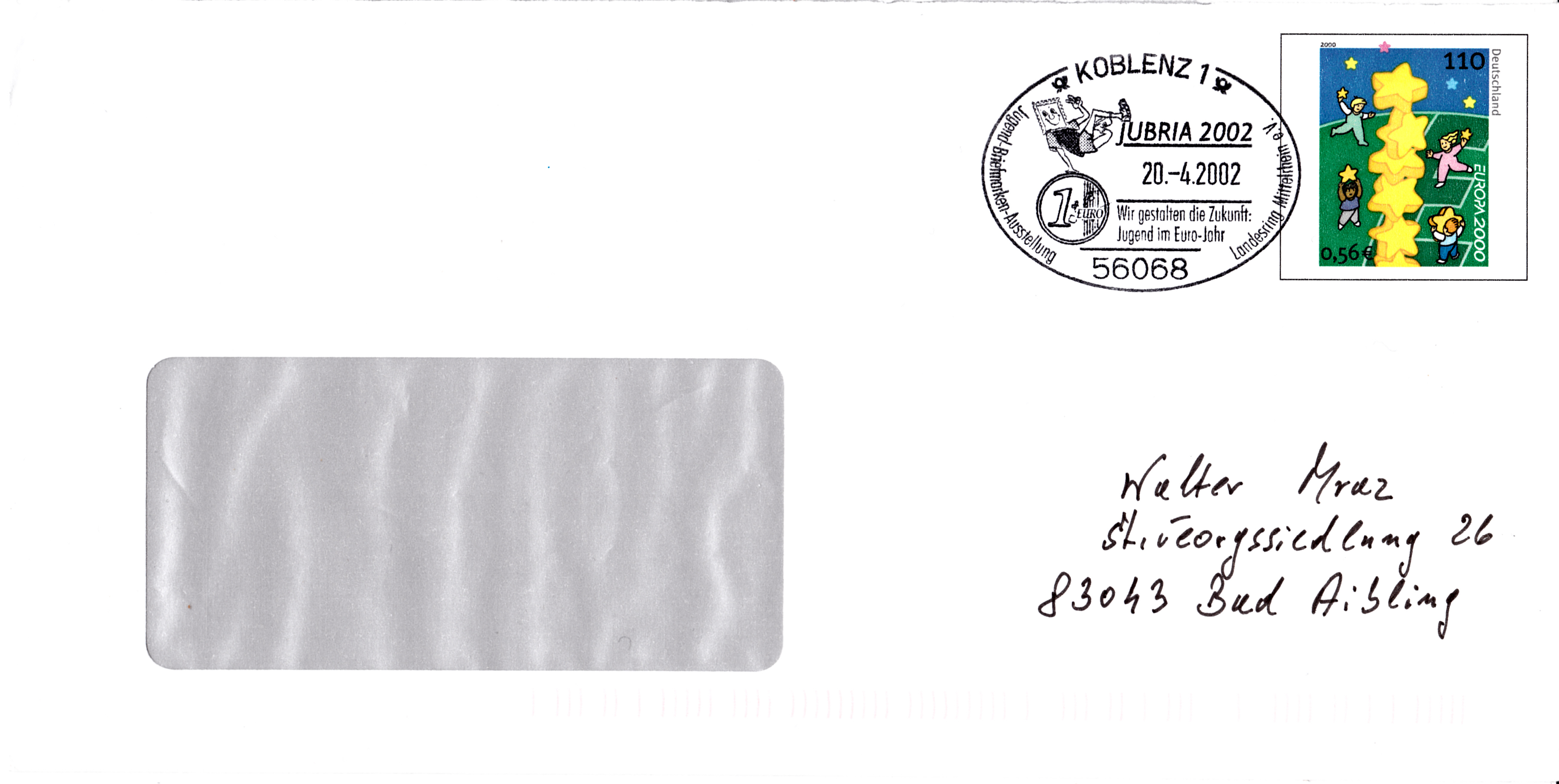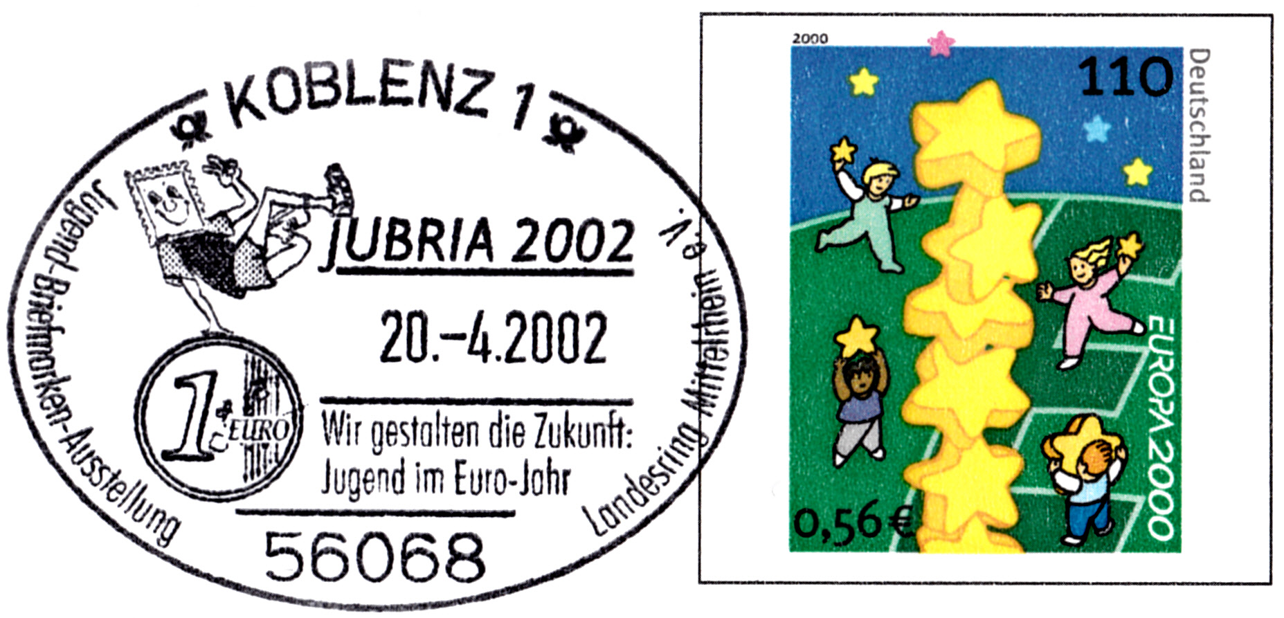 Im Sonderstempel vom 20.4.2002 aus Koblenz zu einer Briefmarkenausstellung der Jugend auf einem Plusbrief mit dem Wertstempel "Europa 2000" (MiNr USo 21 B I b) wird auch eine 1-Euro-Münze gezeigt.