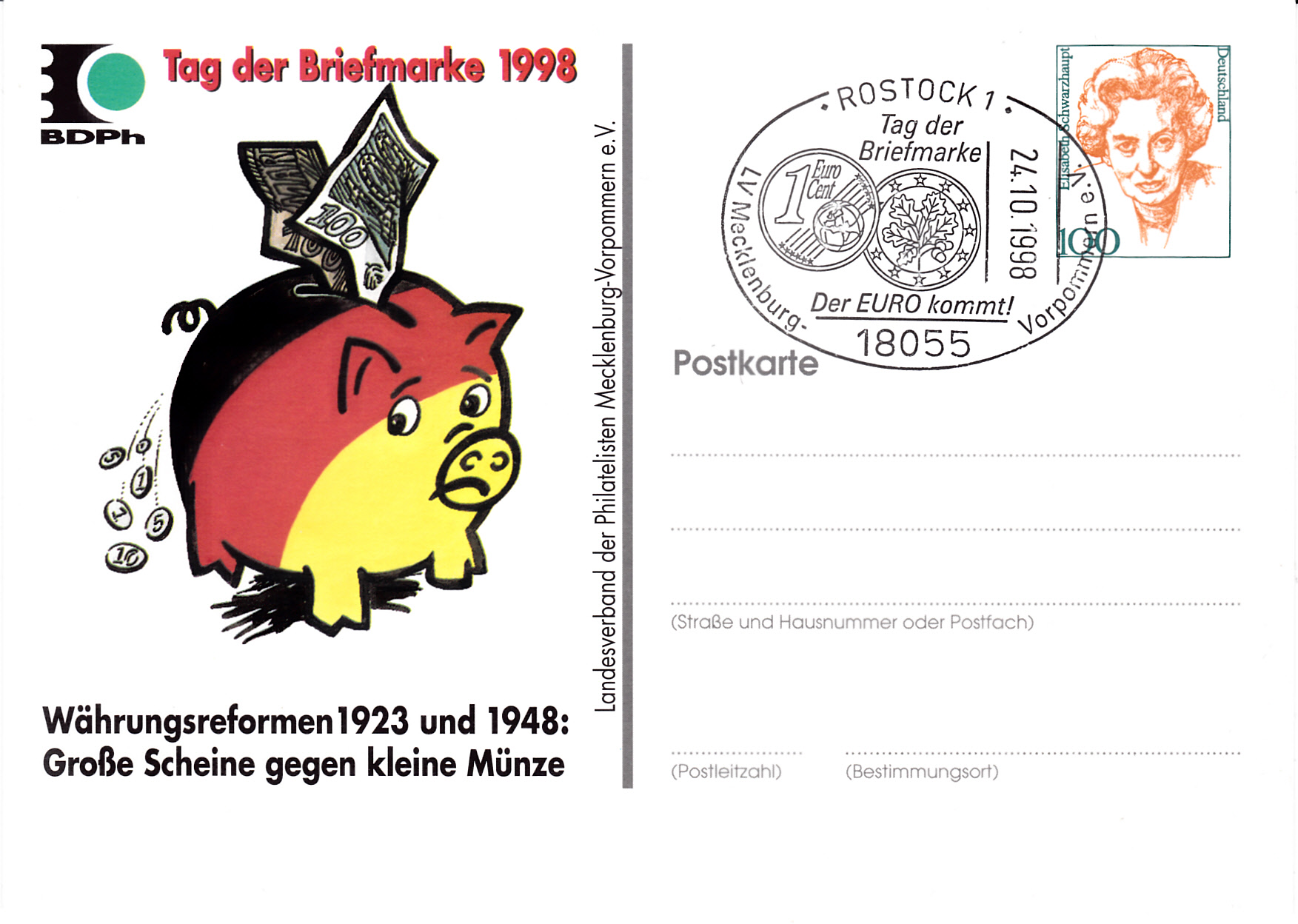 Ganzsache des LV der Philatelisten Mecklenburg-Vorpommern e.V. mit dem dazu passenden Sonderstempel vom 24.10.1998 aus Rostock zum Tag der Briefmarke 1998. Im Stempelbild wird ein Eurocent gezeigt.