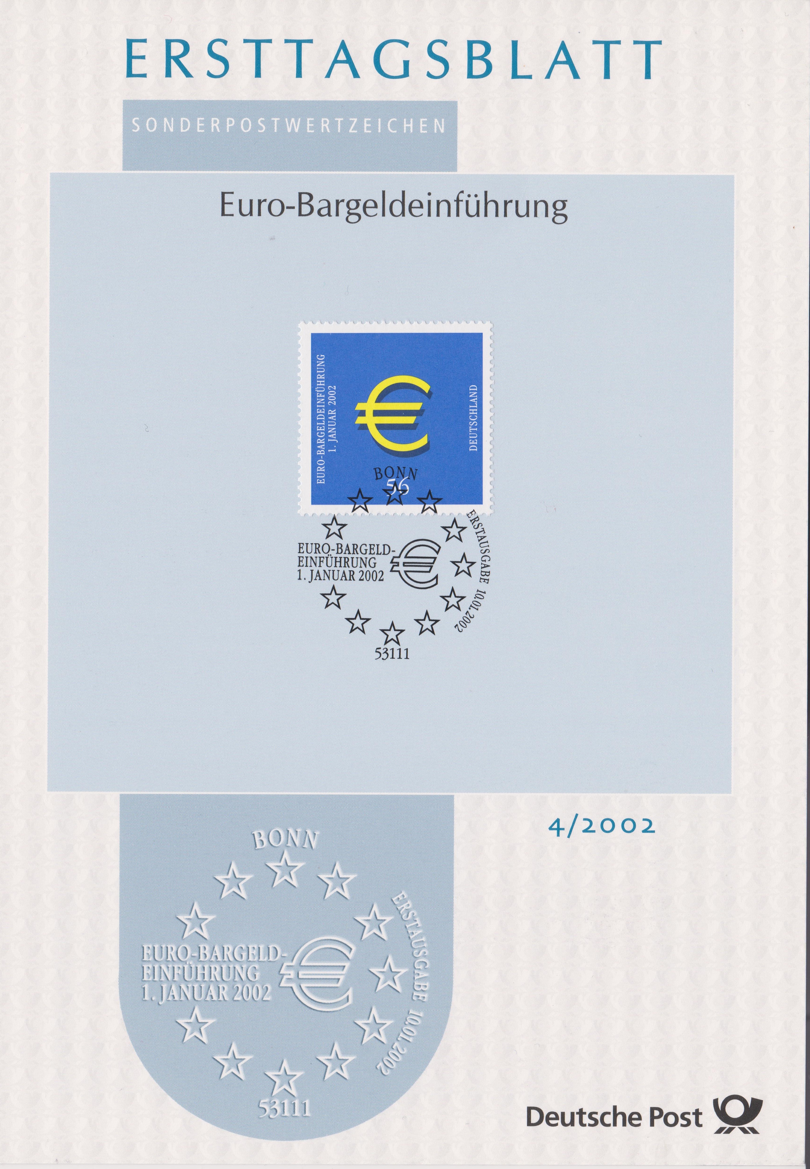 Zur Einführung der Euro-Münzen und -Banknoten erschien in Österreich am 1.1.2002 eine Marke (MiNr 2368) mit der Abbildung einer 1-Euro-Münze, der Europasterne und einer Europakarte mit Hervorhebung des Euro-Währungsgebietes.