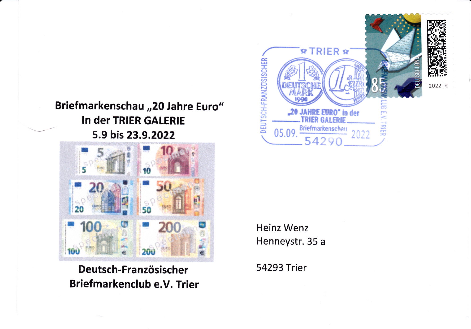Aus Anlass "20 Jahre Einführung des Euro" wurde ein Ganzsachenumschlag mit dem Wertstempel zu 56 Cent mit dem Motiv "Einführung der Euro-Münzen und -Banknoten" und einem Wertstempel zu 0,29€ im Muster einer Automatenmarke herausgegeben.