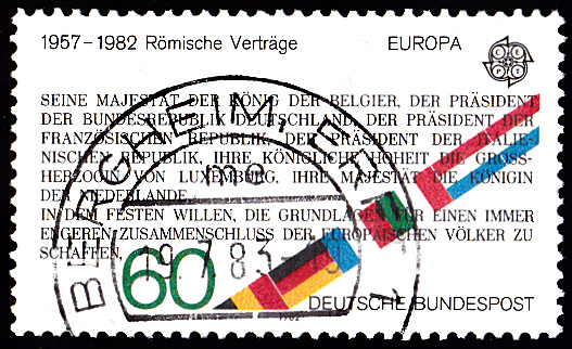 Die Europamarke 1982 zu 60Pf der Deutschen Bundespost (MiNr 1131) zum Gemeinschaftsthema "Historische Ereignisse" würdigte das Jubiläum "25 Jahre Römische Verträge". Im Markenbild wird ein Auszug aus dem Vertragstext der Römischen Verträge gezeigt.