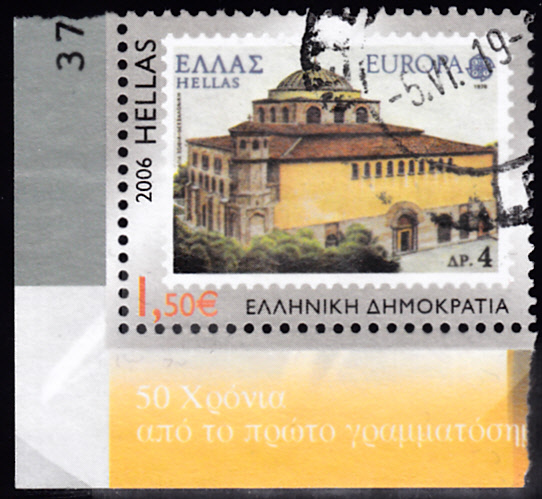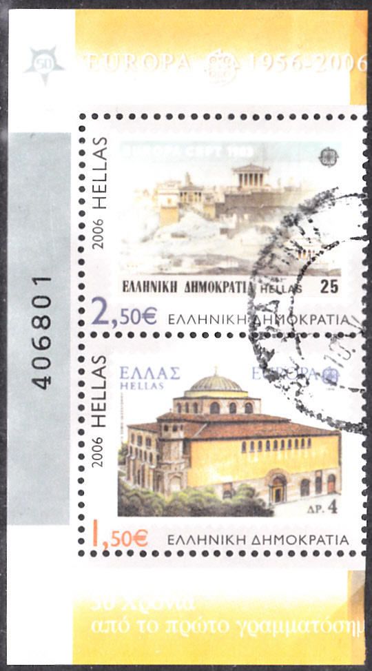 Hier zeige ich ein Marke aus Griechenland (MiNr 2339) die in einer Blockausgabe (MiNr Block 40) erschienen ist. Auf der Marke wird die Europamarke aus Griechenland aus dem Jahre 1983 (MiNr 1513) mit der Akropolis in Athen gezeigt.