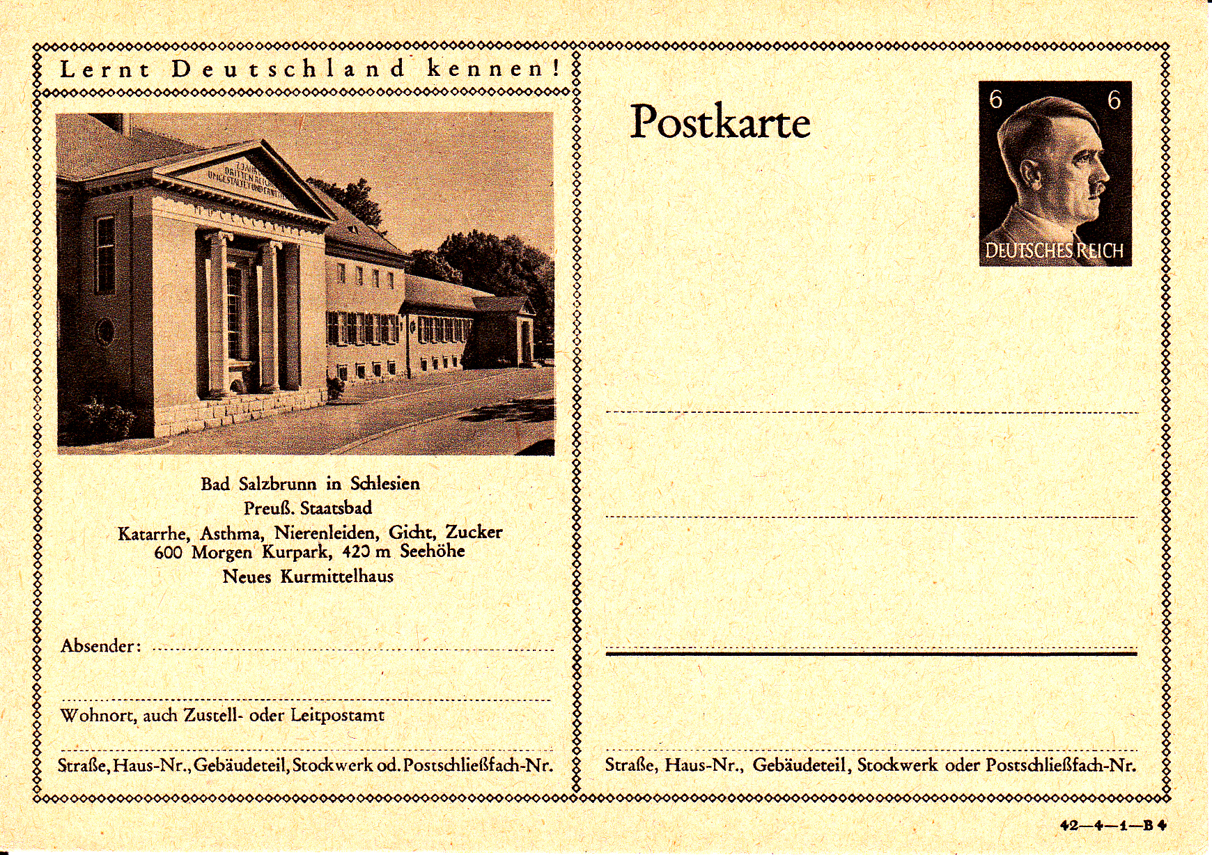 Ich beginne mit der Karte mit dem Druckvermerk 42-4-1-B1 (Ausgabejahr 1942-Serie 4-Druckplatte 1-Bild 1; bei weiteren Karten nenne ich jeweils die Serie und die Bildnummer, die Druckplattennummer nur, wenn es verschiedene Druckplattennummern bei der jeweiligen Serie gibt).