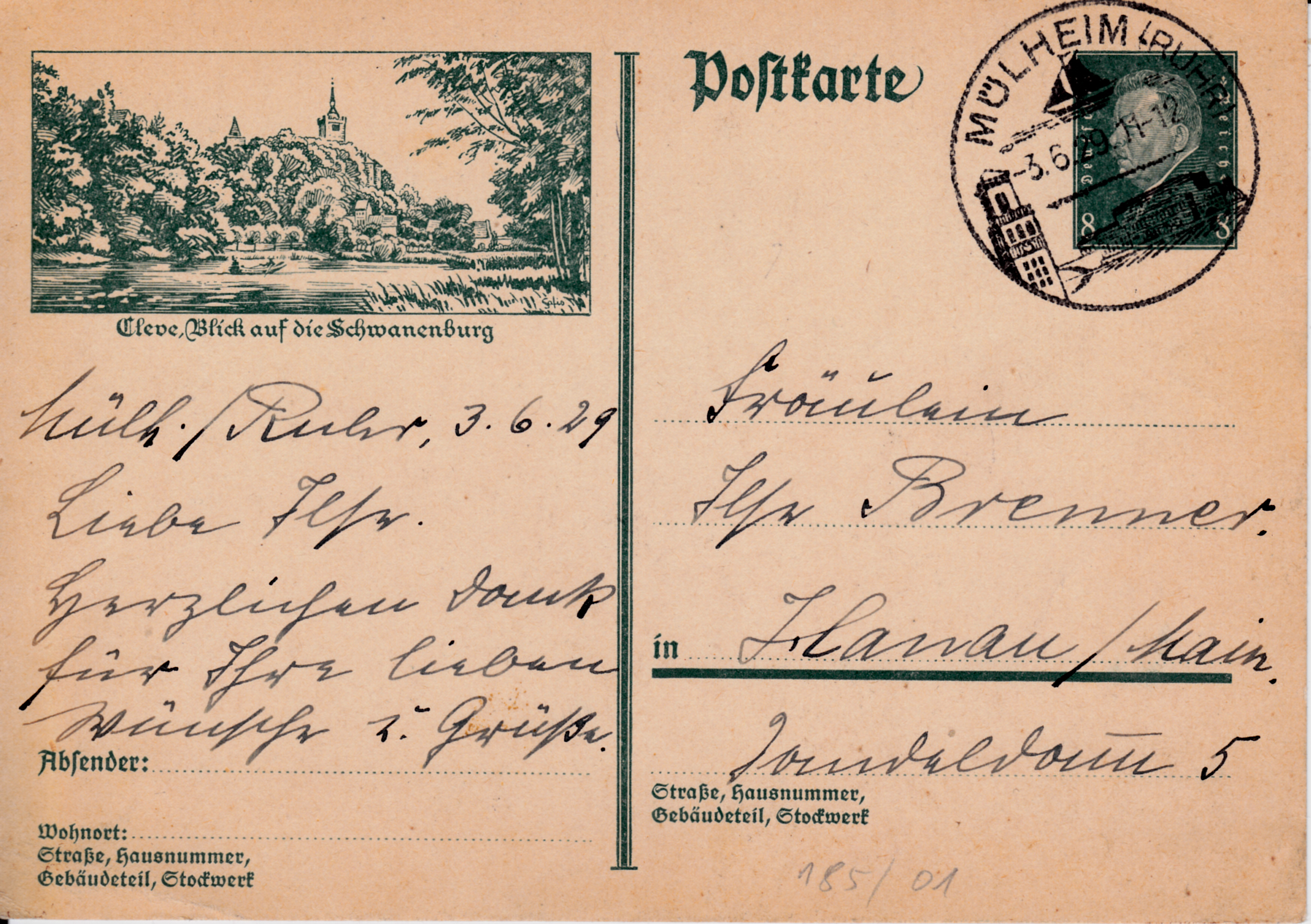 Ich beginne mit der Bildpostkarte MiNr P 185/01. Sie zeigt ein Bild der Schwanenburg, dem Wahrzeichen der Stadt Kleve.