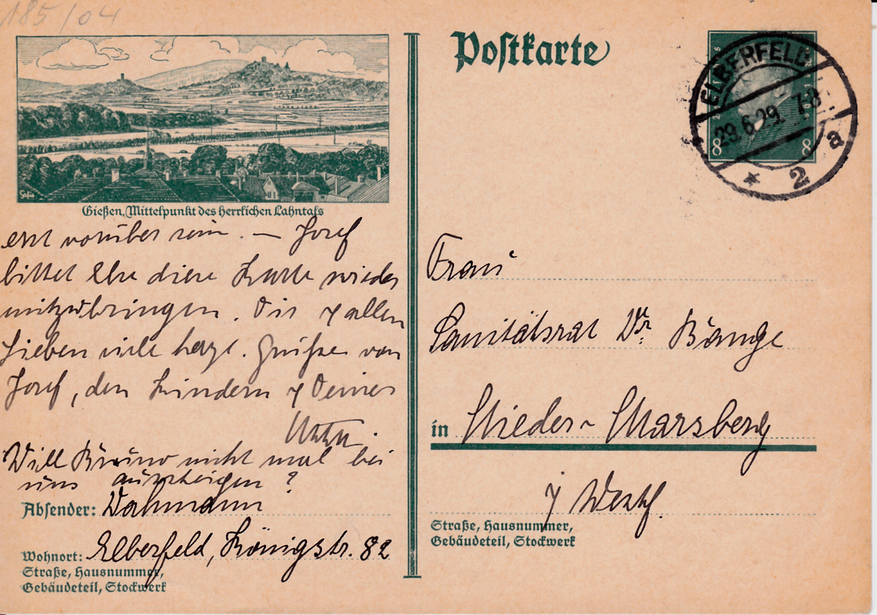 Die nächste Bildpostkarte (MiNr P 185/04) zeigt einen Blick auf Gießen, im Hintergrund links Burg Vetzberg, rechts Burg Gleiberg, dahinter der Dünsberg.