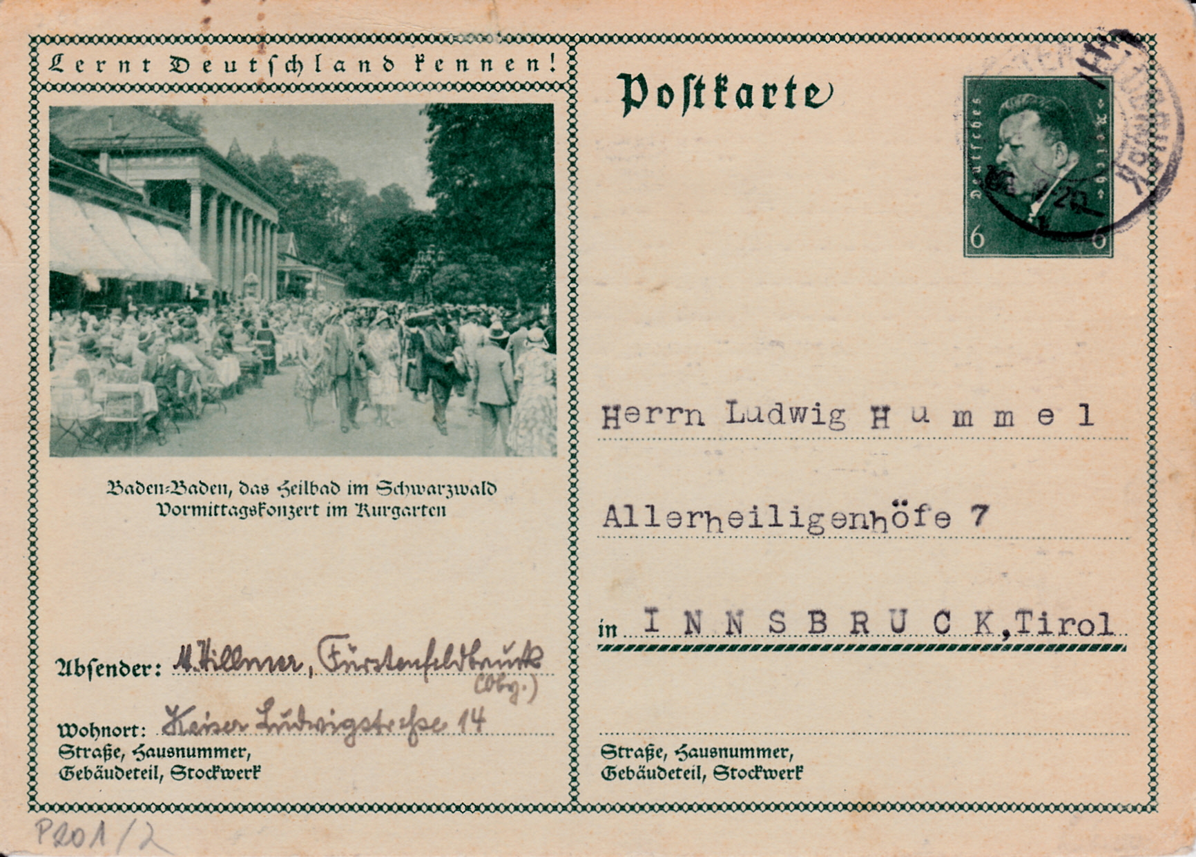 Hier zeige ich die Bildpostkarte mit der MiNr P 201/01 und einer Abbildung aus Baden-Baden.