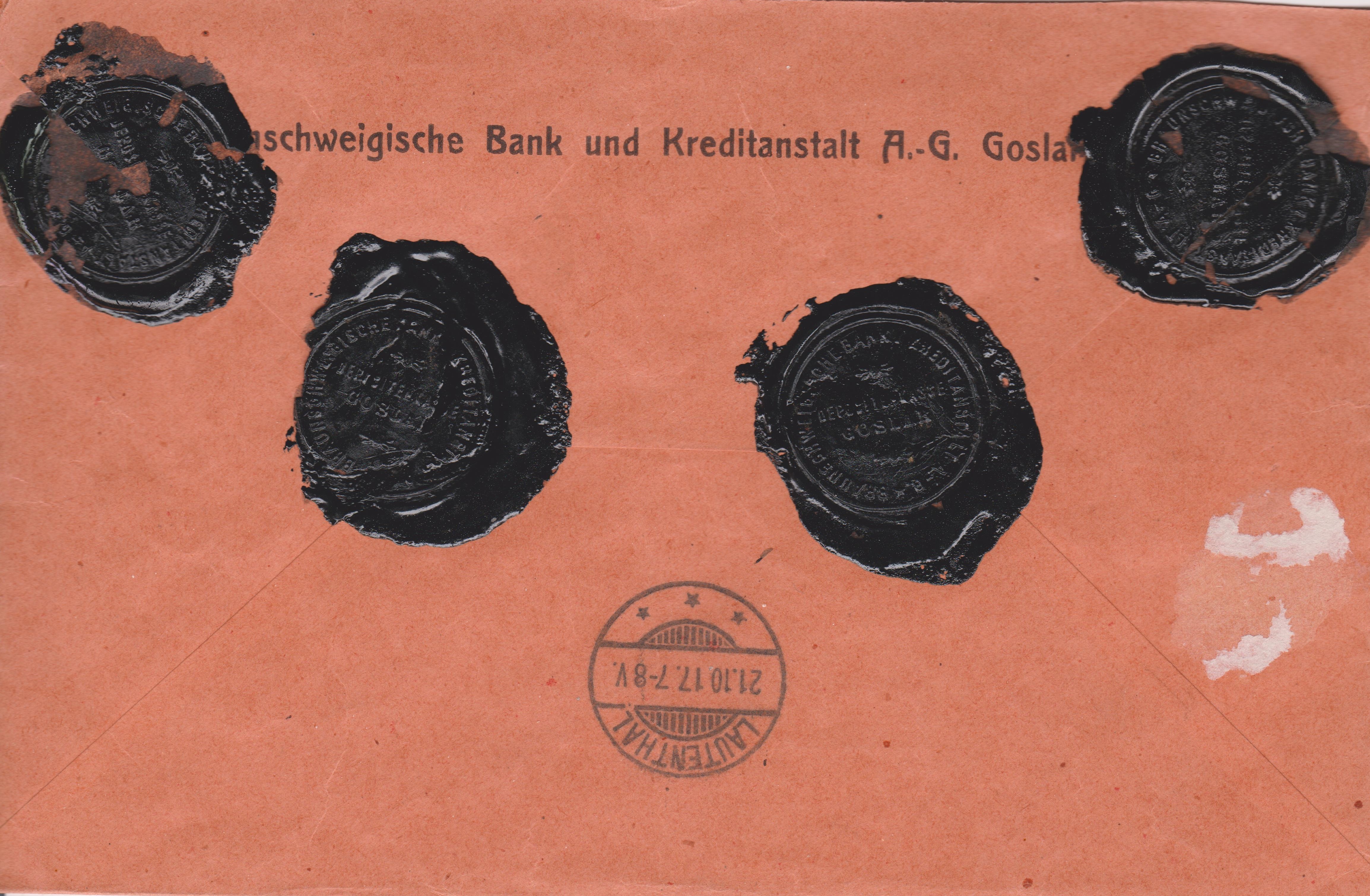 Dieser "39 g" schwere, nach LAUTERTHAL adressierte Brief wurde mit dem Vermerk "Inliegend Mark: Fünfhundert" am 20.10.1917 in GOSLAR aufgegeben: