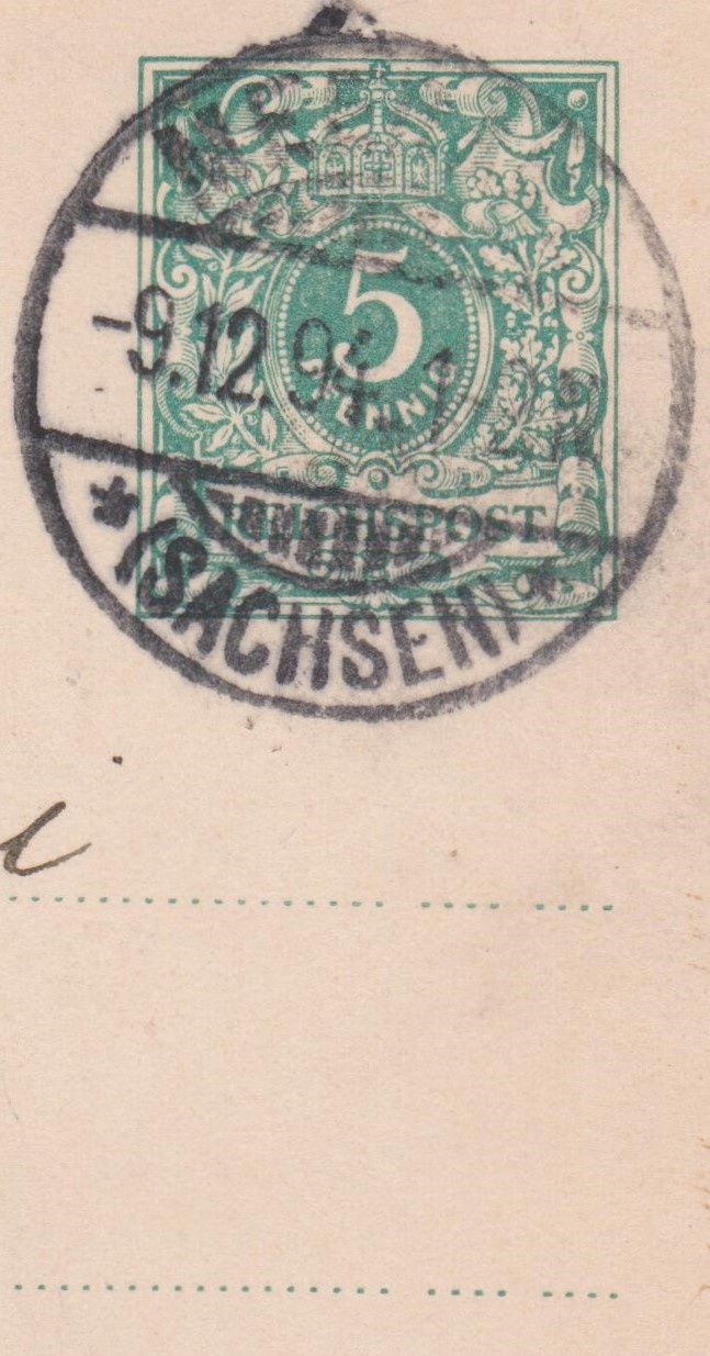 Ganzsache Deutsches Reich P 30 I mit Eindruck 5 Pf Freimarken Wertziffer und Krone im Perlenoval, Druckvermerk 593 d unten rechts, mit Punktlücke l 20 (=> der 20. Punkt von links fehlt!):