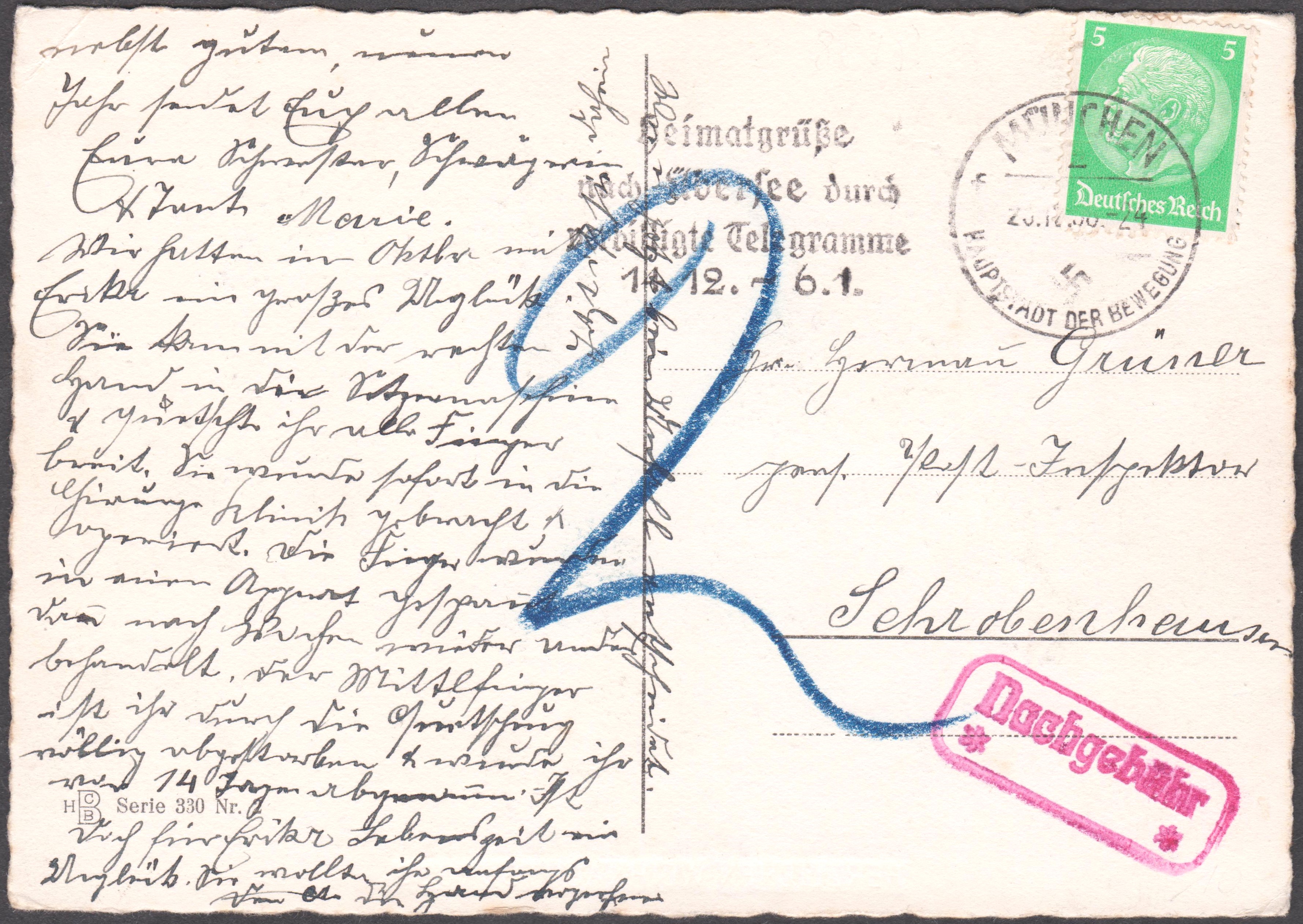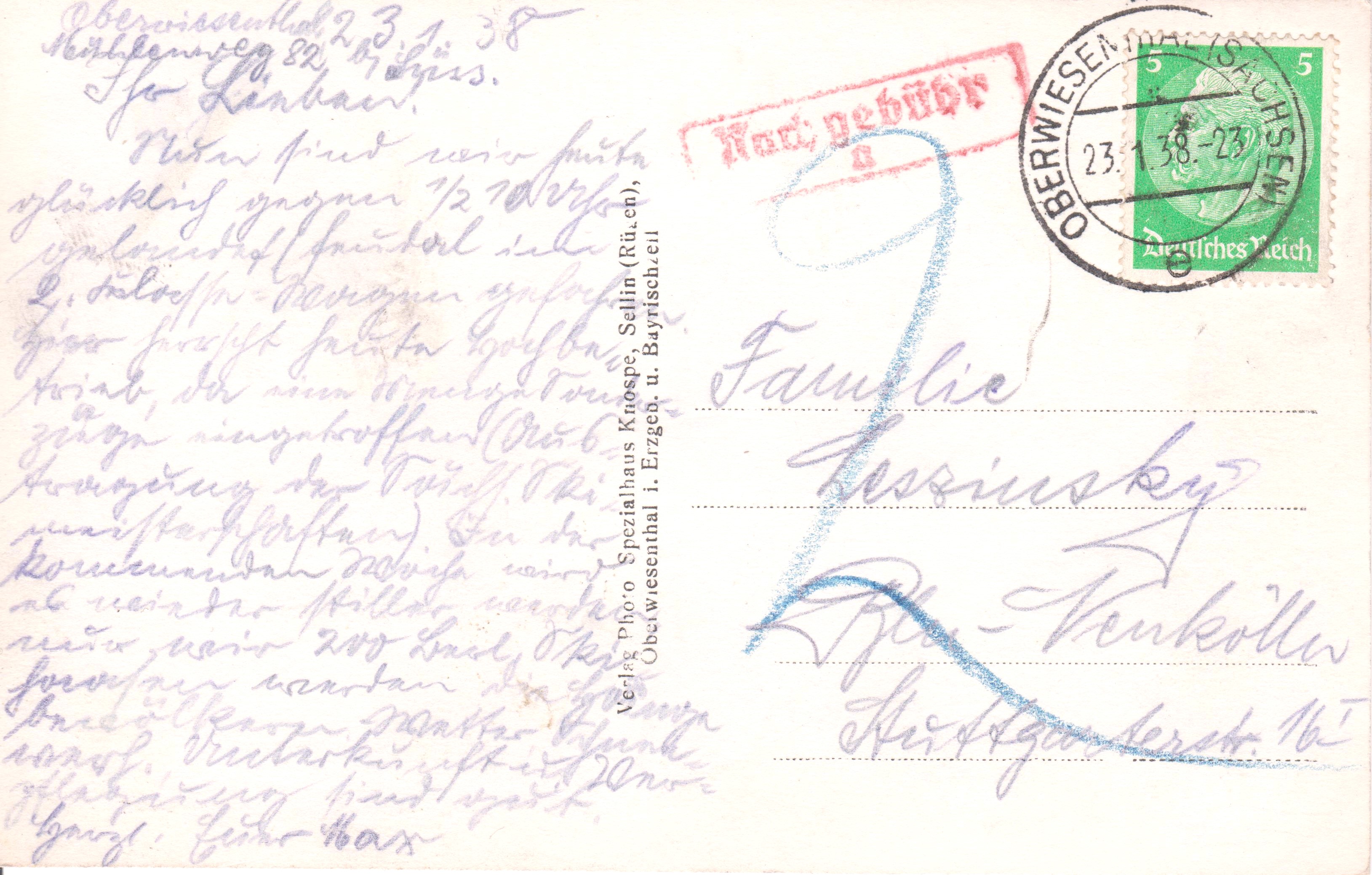 Daher erhob die Post beim Empfänger "2" Pf als Nachgebühr, worauf ein Stempel in Rot hinweist!