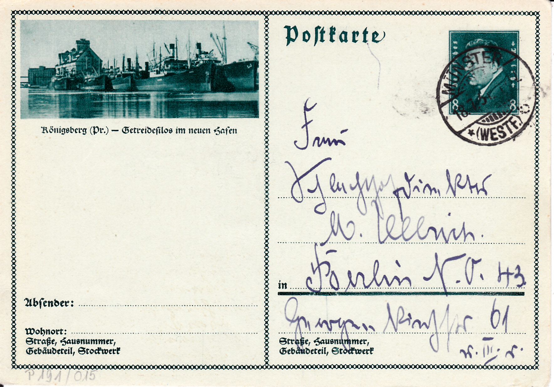 Auf dieser Bildpostkarte (MiNr P 191/17) sehen wir die Marienburg, eine im 13. Jahrhundert erbaute mittelalterliche Ordensburg des Deutschen Ordens am Fluss Nogat, einem Mündungsarm der Weichsel. Heute liegt sie in der polnischen Stadt Malbork (deutsch Marienburg).