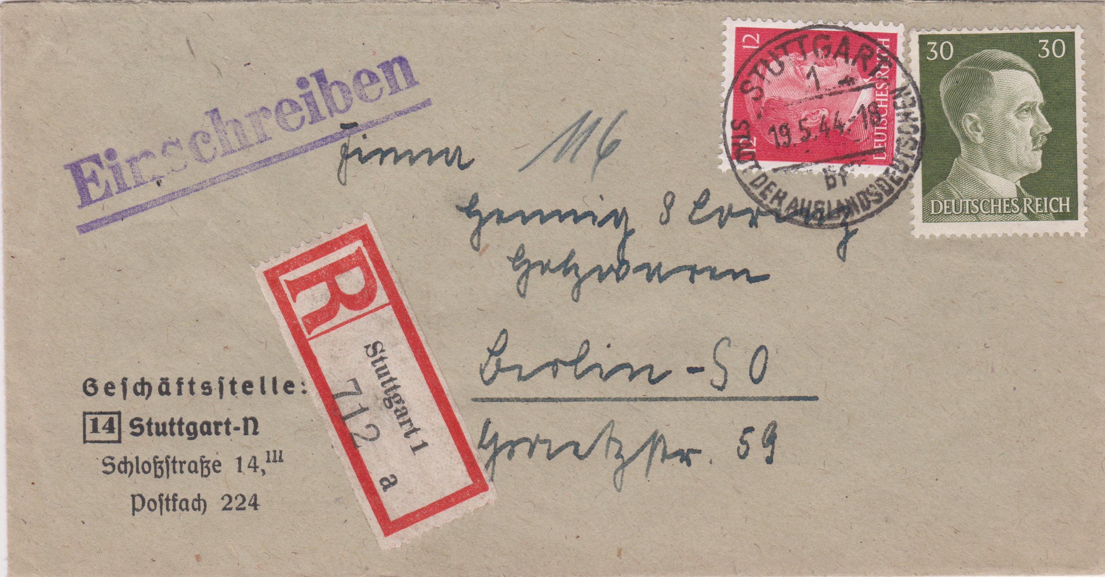 Portostufe 42 Pf auf einem Brief im Fernverkehr (12 Pf) per Einschreiben (30 Pf), aufgegeben am 19.05.1944 in Stuttgart 1, entwertet mit Tagesstempel "STUTTGART 1 bf STADT DER AUSLANDSDEUTSCHEN":