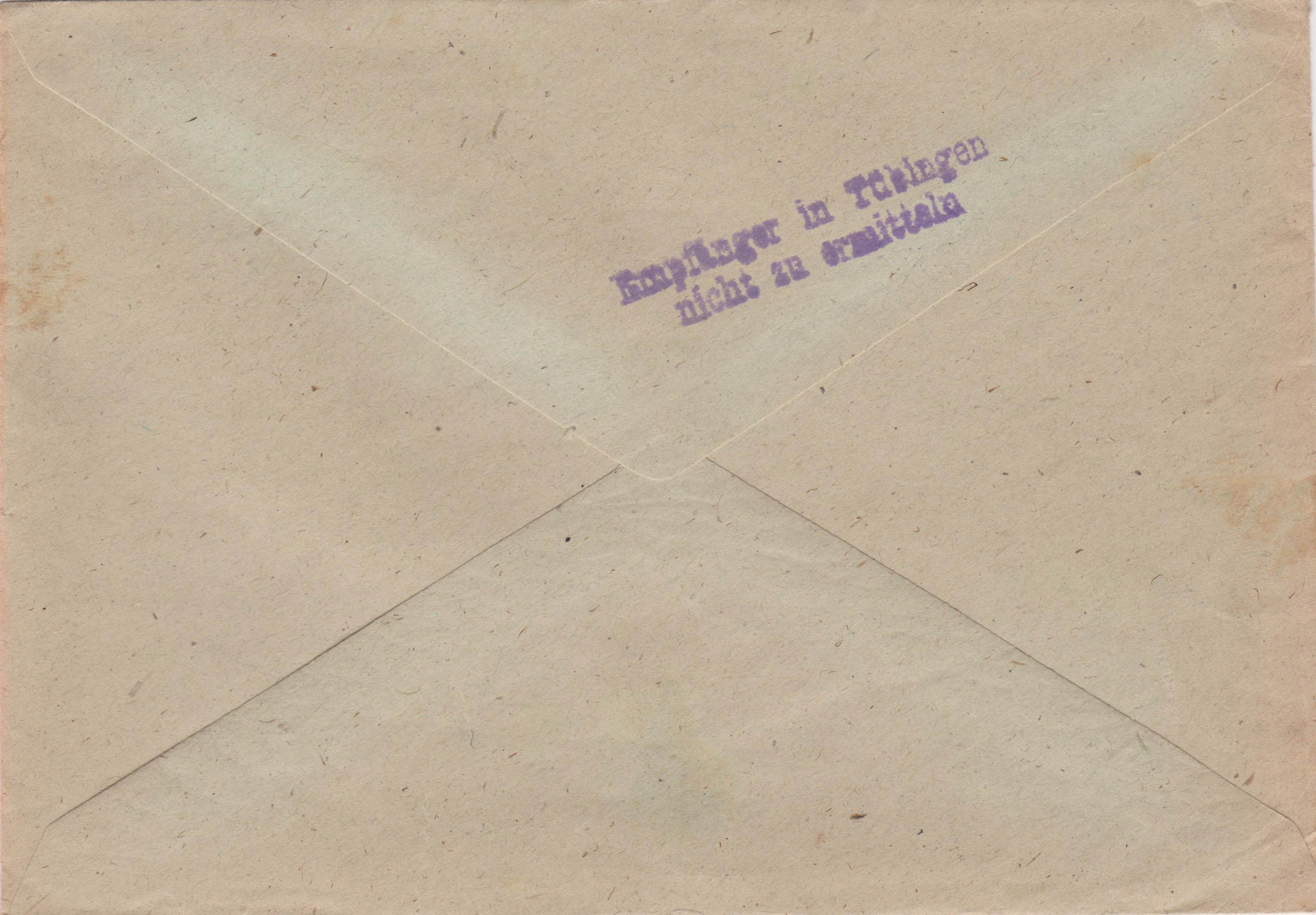 Bei diesem Beleg handelt es sich um einen sogenannten "Überroller". Als "Überroller" bezeichnet man Sendungen, die auf dem Postweg innerhalb Deutschlands von den Alliierten erbeutet und von ihnen zensuriert wurden. Dieser Beleg wurde linksseitig geöffnet und mit einem Verschlußzettel mit Druckdatum "8.45", Wolter Nr. 5, wieder verschlossen, was ein Prüferstempel "MILITARY CENSORSHIP CIVIL MAILS 13250", Wolter Nr. 2a, dokumentiert.