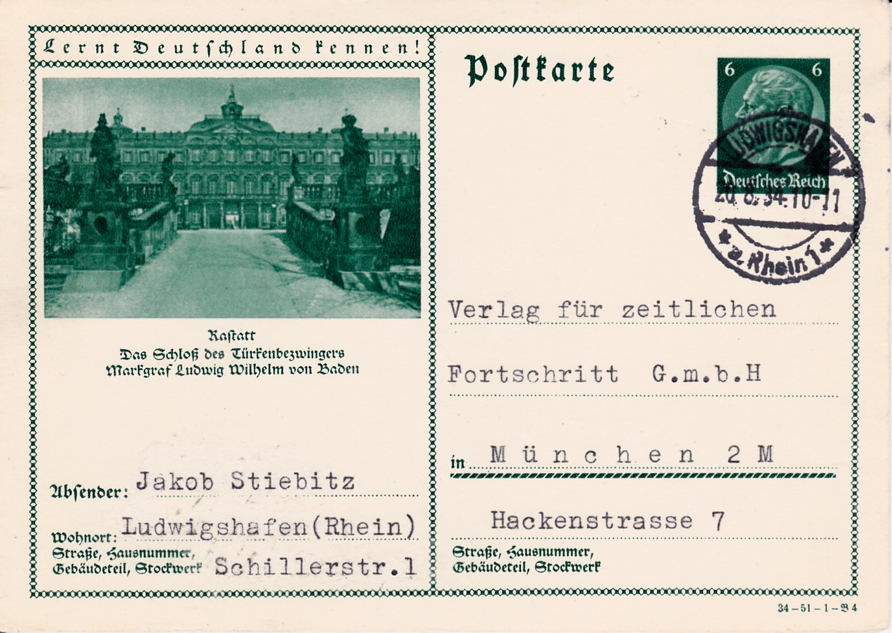 Die Stadt Karlsruhe zeigt auf dieser Karte (Serie 51 Bild 3) ein Foto mit dem Turm des Schlosses Karlsruhe. Das Karlsruher Schloss wurde ab 1715 im Stile des Barocks als Residenz des Markgrafen Karl Wilhelm von Baden-Durlach errichtet. Es diente bis 1918 als Residenzschloss der Markgrafen bzw. Großherzöge von Baden. Heute ist in dem Gebäude das Badische Landesmuseum und ein Teil des Bundesverfassungsgerichts untergebracht.