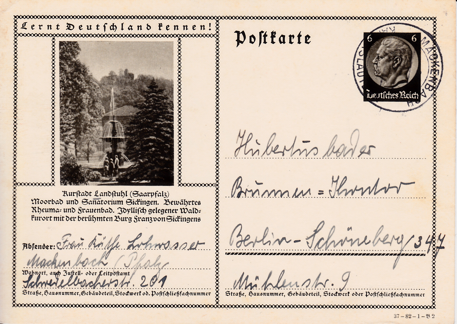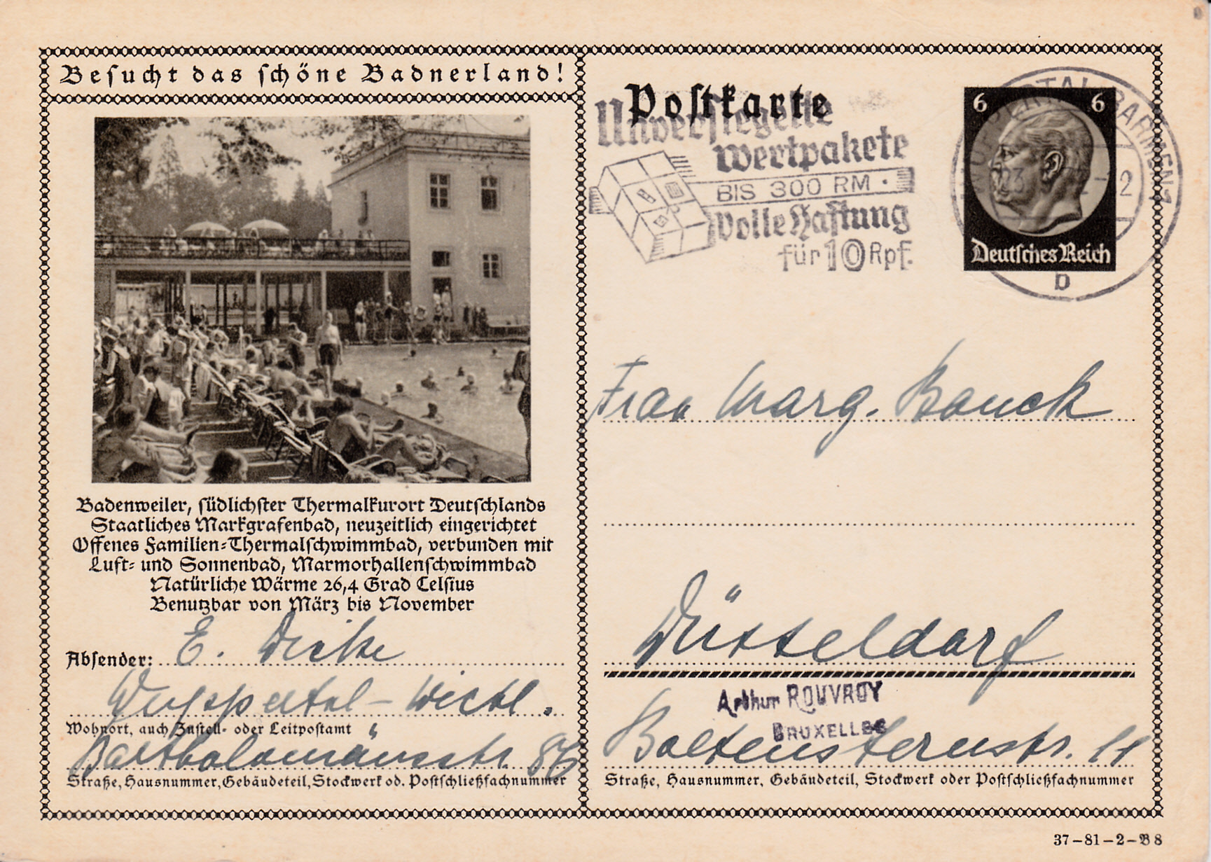Auch 1937 ist Bad Mergentheim mit einer Bildpostkarte (Serie 82 Bild 3) vertreten. Abgebildet ist die Wandelhalle mit Brunnentempeln.